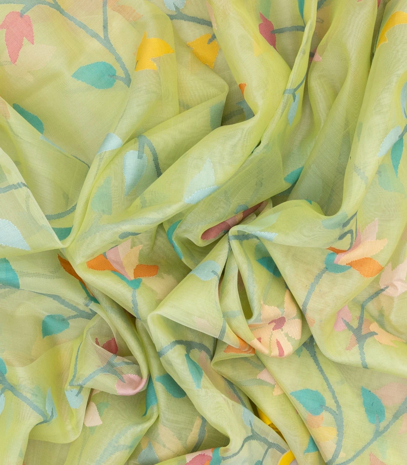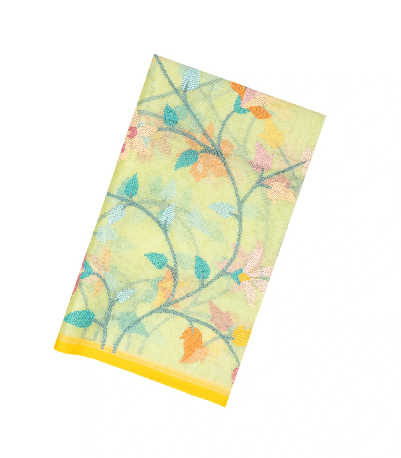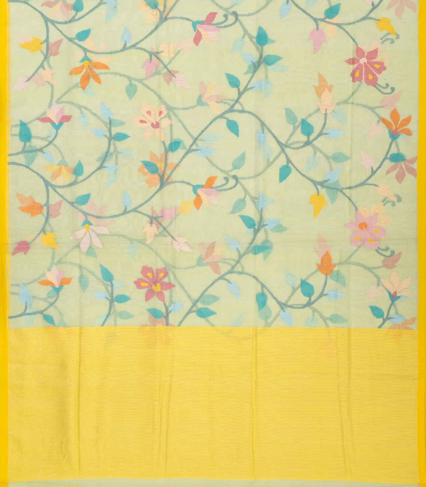 This handwoven banarasi organza silk saree is filled with meena floral vine motifs in light yellow body along with contrast border and pallu