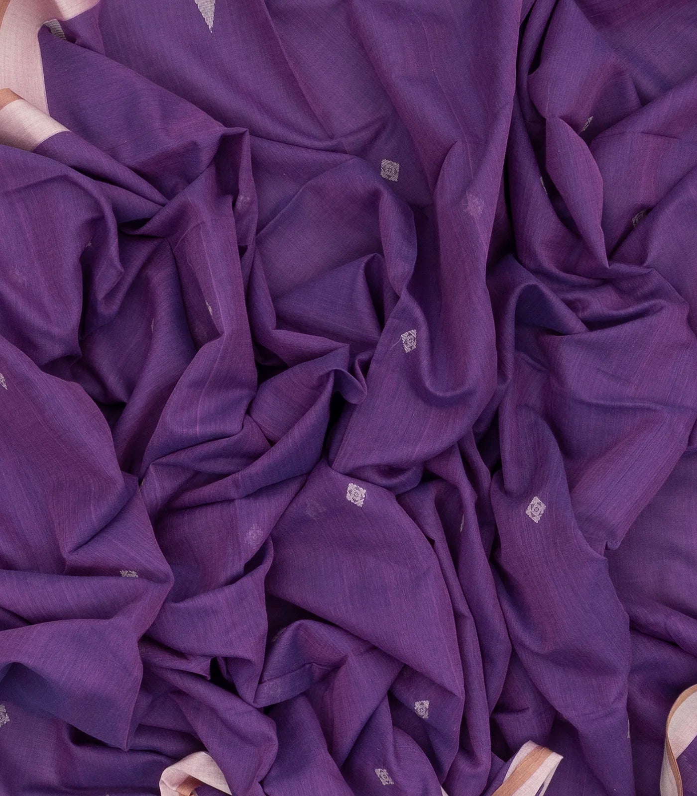 This handwoven bengal cotton saree is filled with floral buttas in lilac body along with contrast temple border and pallu