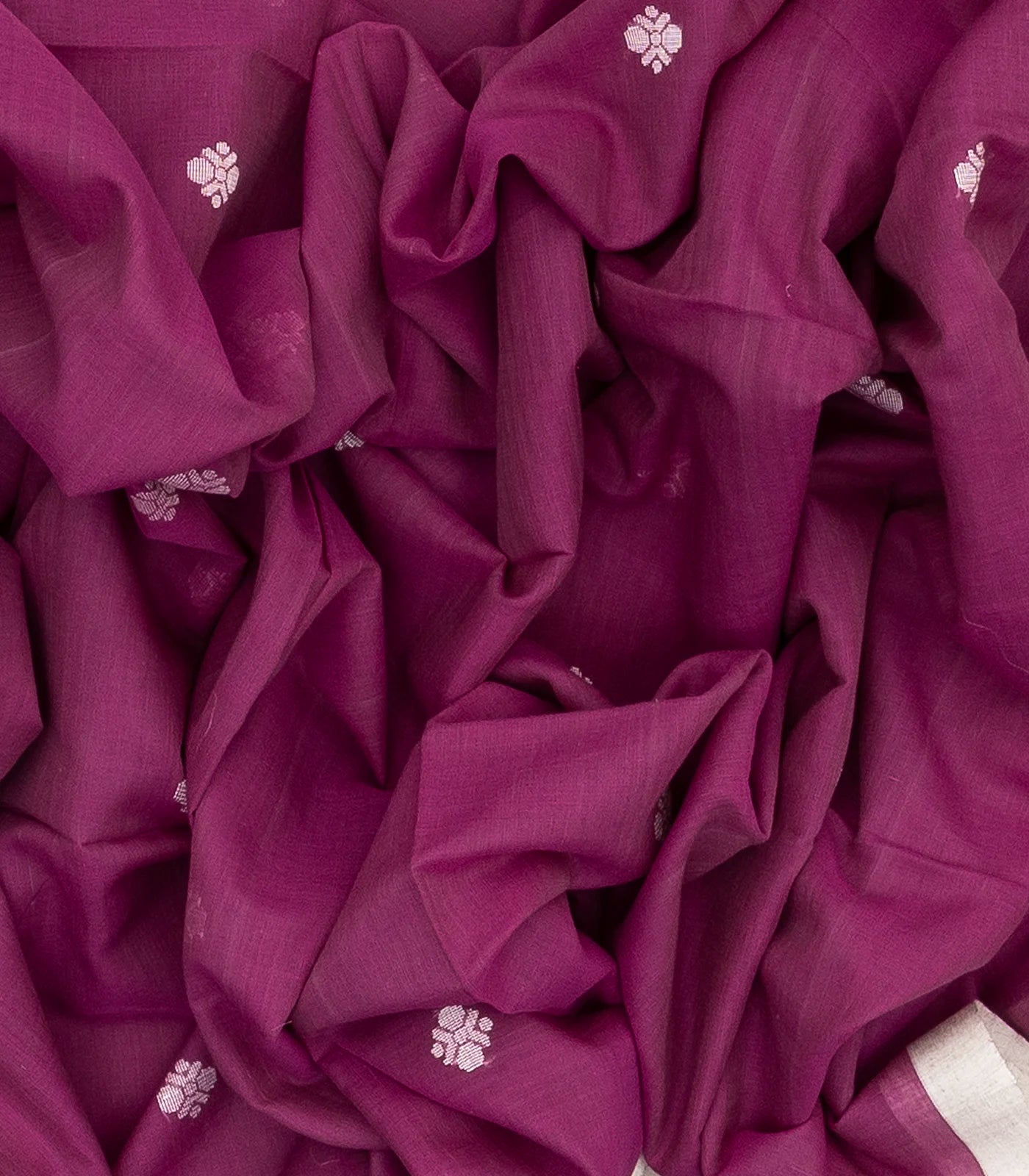 This handwoven bengal cotton saree is filled with floral buttas in lilac body along with contrast border and pallu