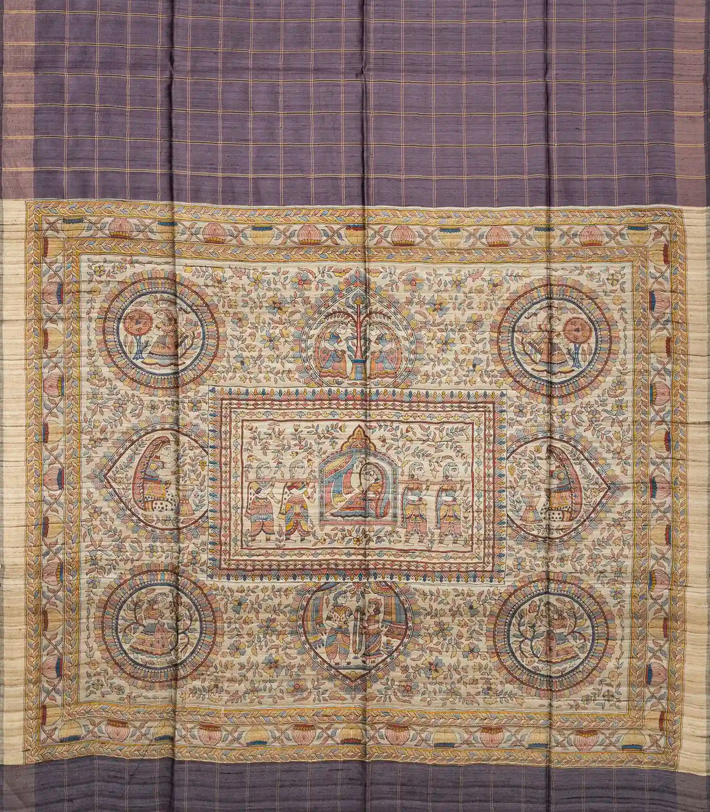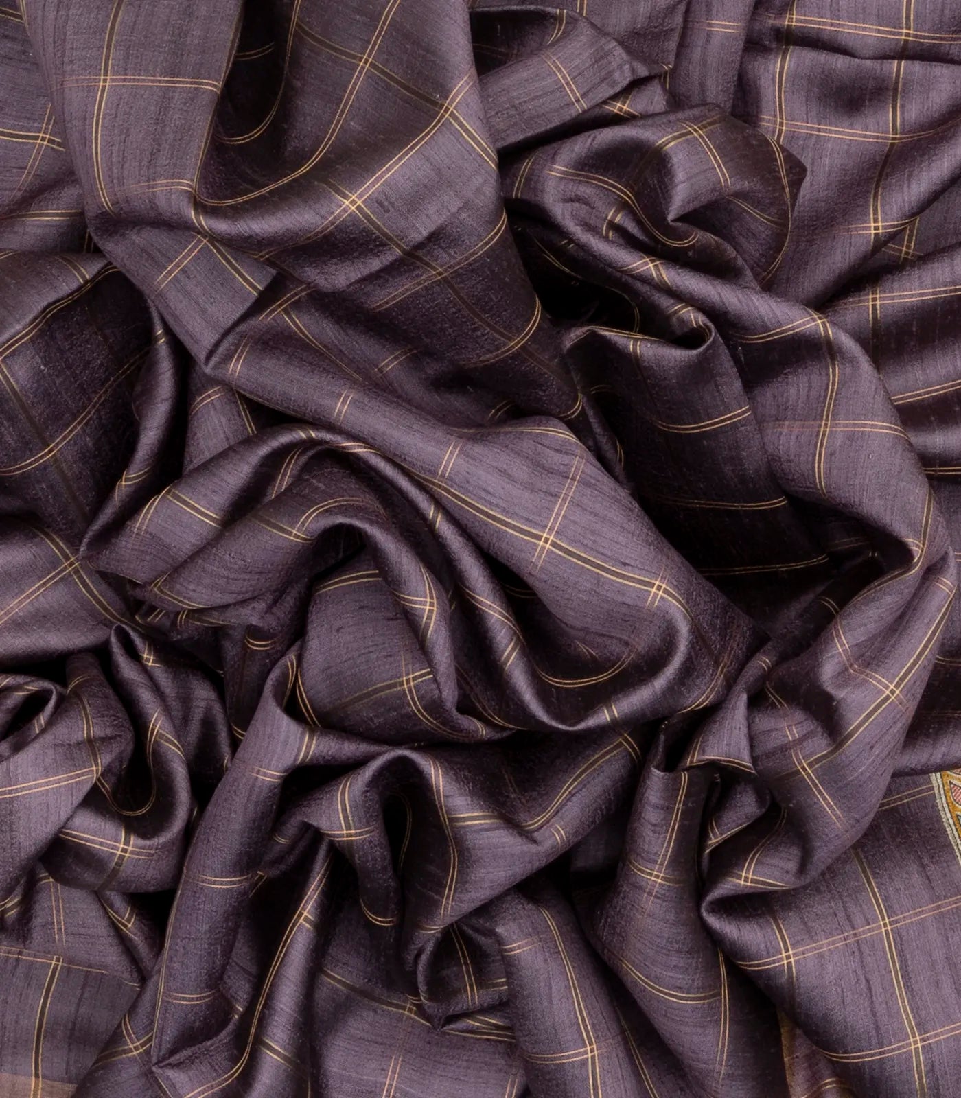 This handwoven dupion silk saree is filled with checks in lilac body along with border and printed fish pallu