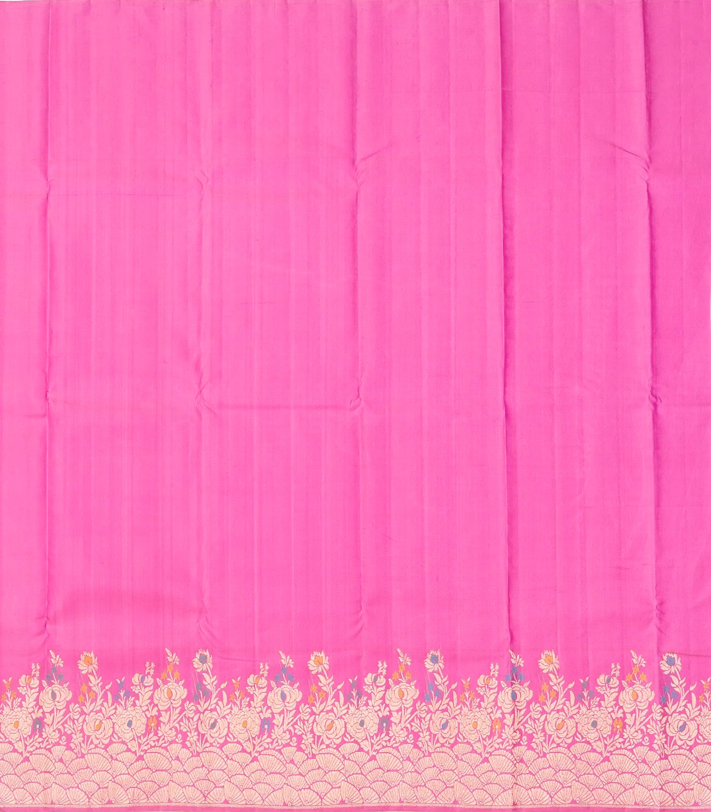 This handwoven kanchipuram silk saree is filled with zari stripes in lilac body along with meena floral motifs in border and pallu