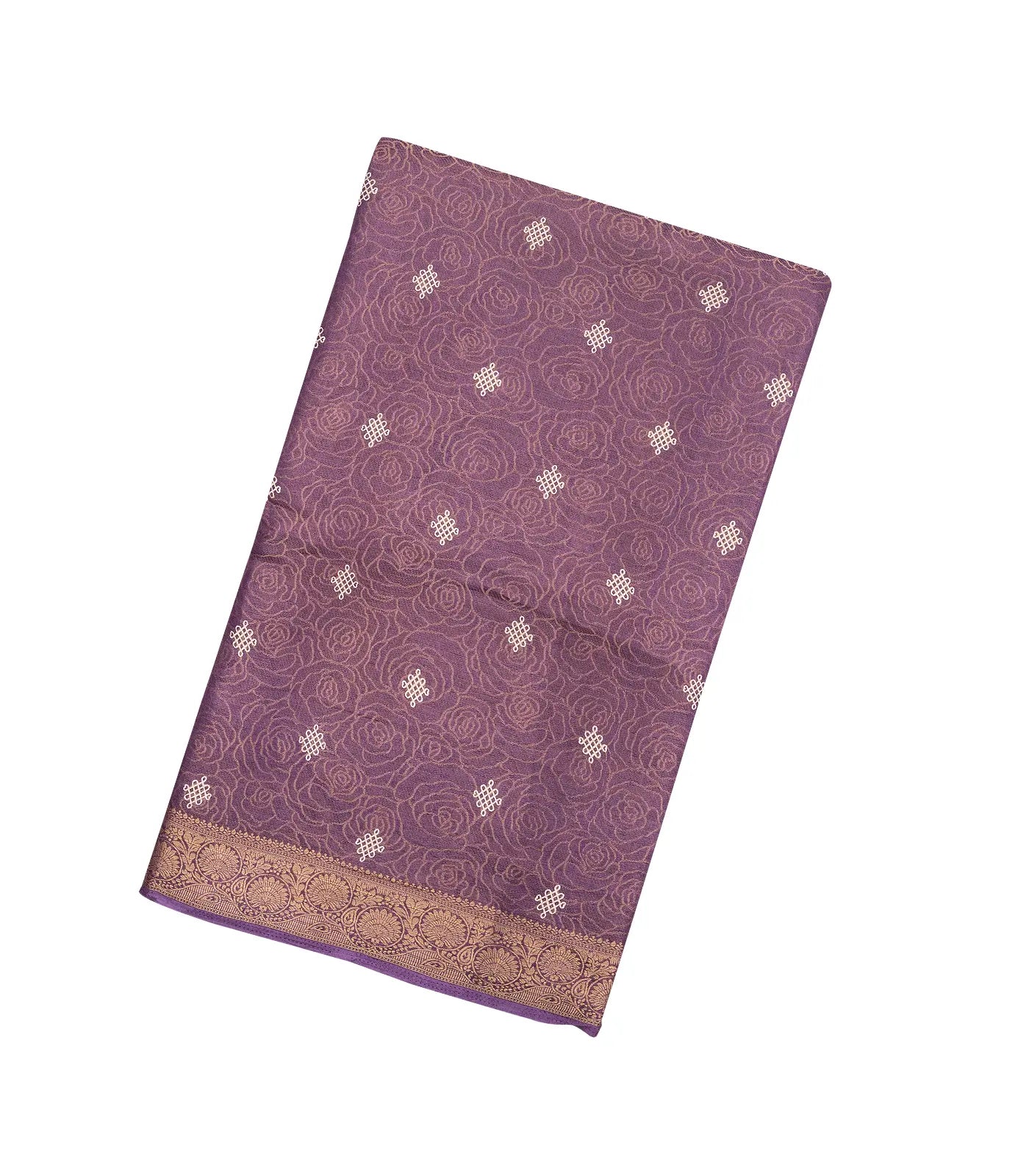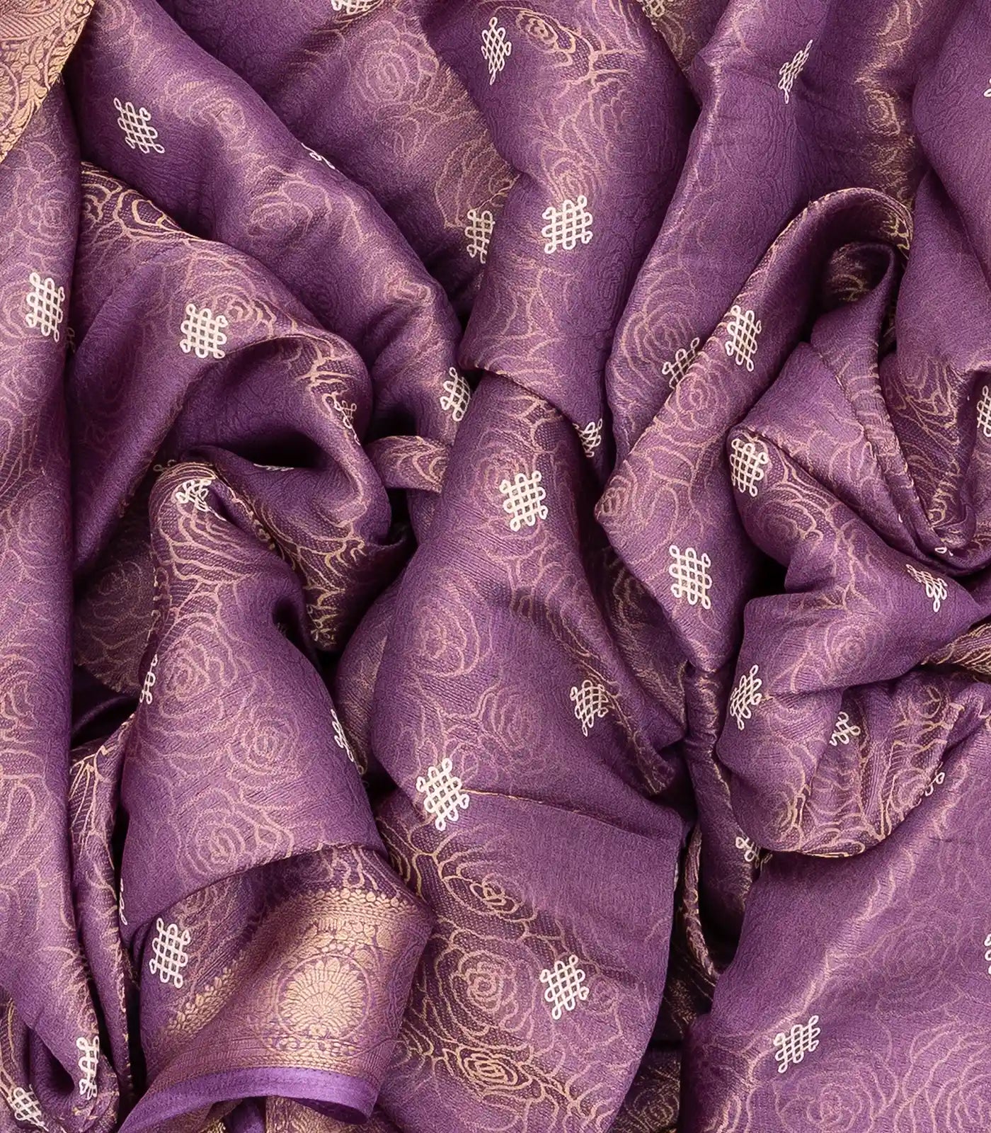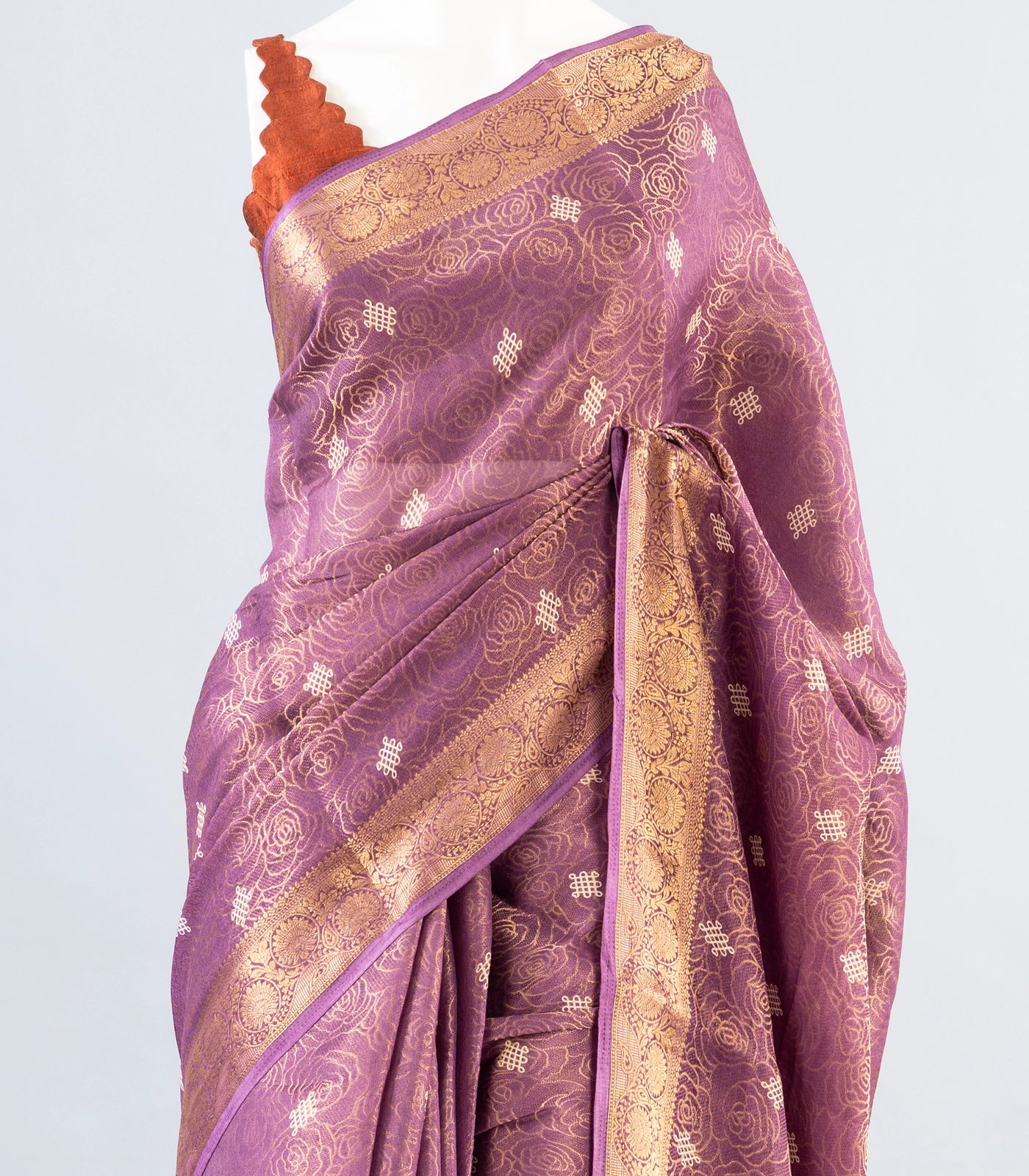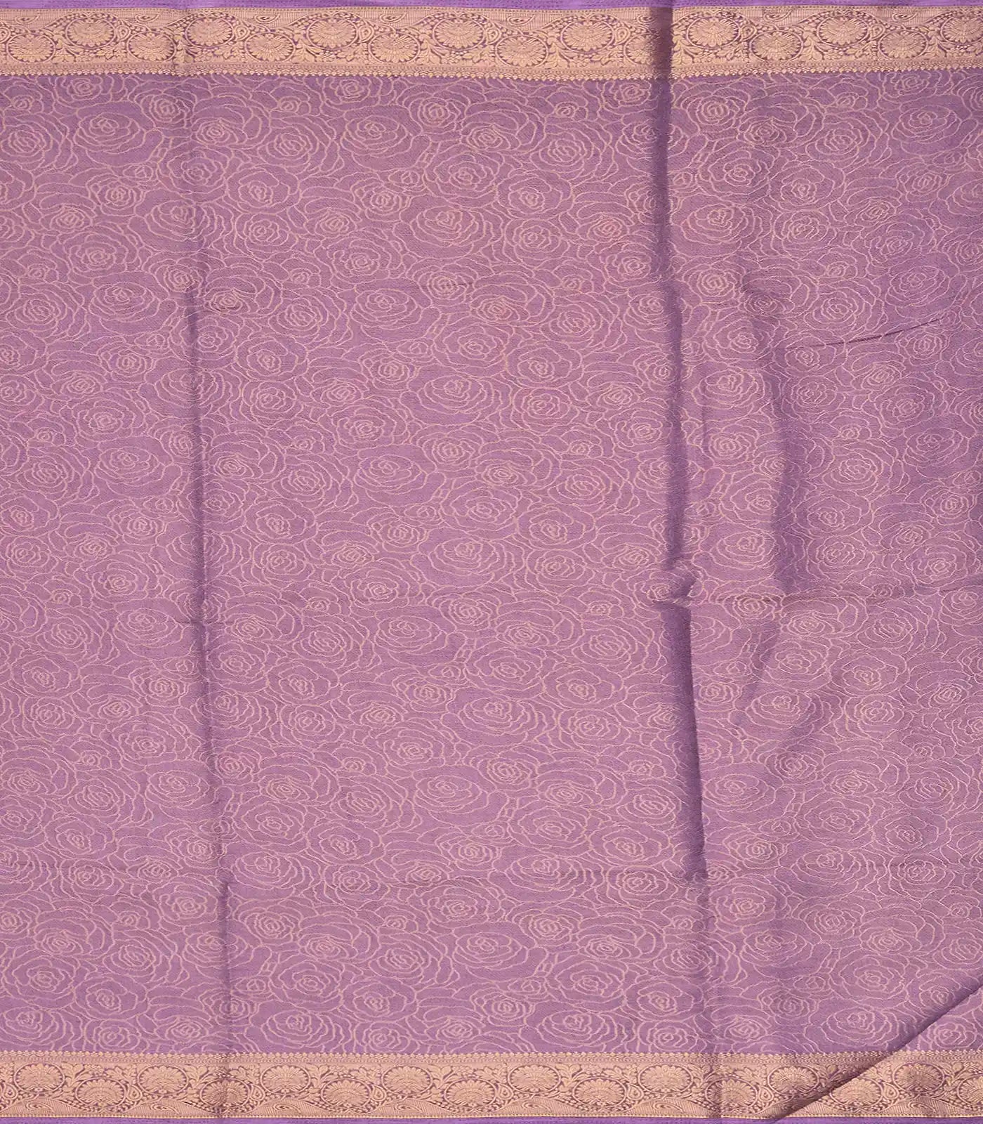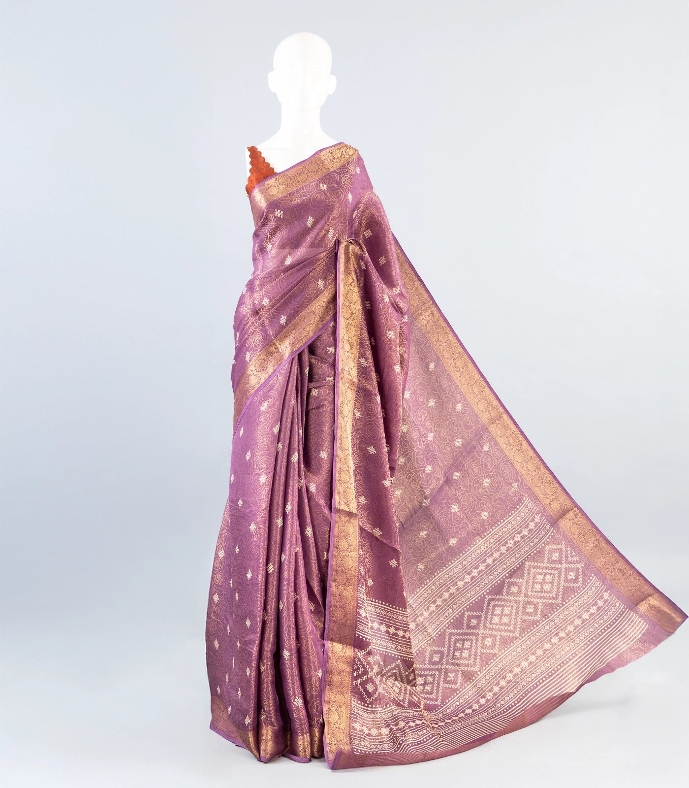 This woven art dola tissue saree is filled with floral motifs in lilac body along with zari border and pallu