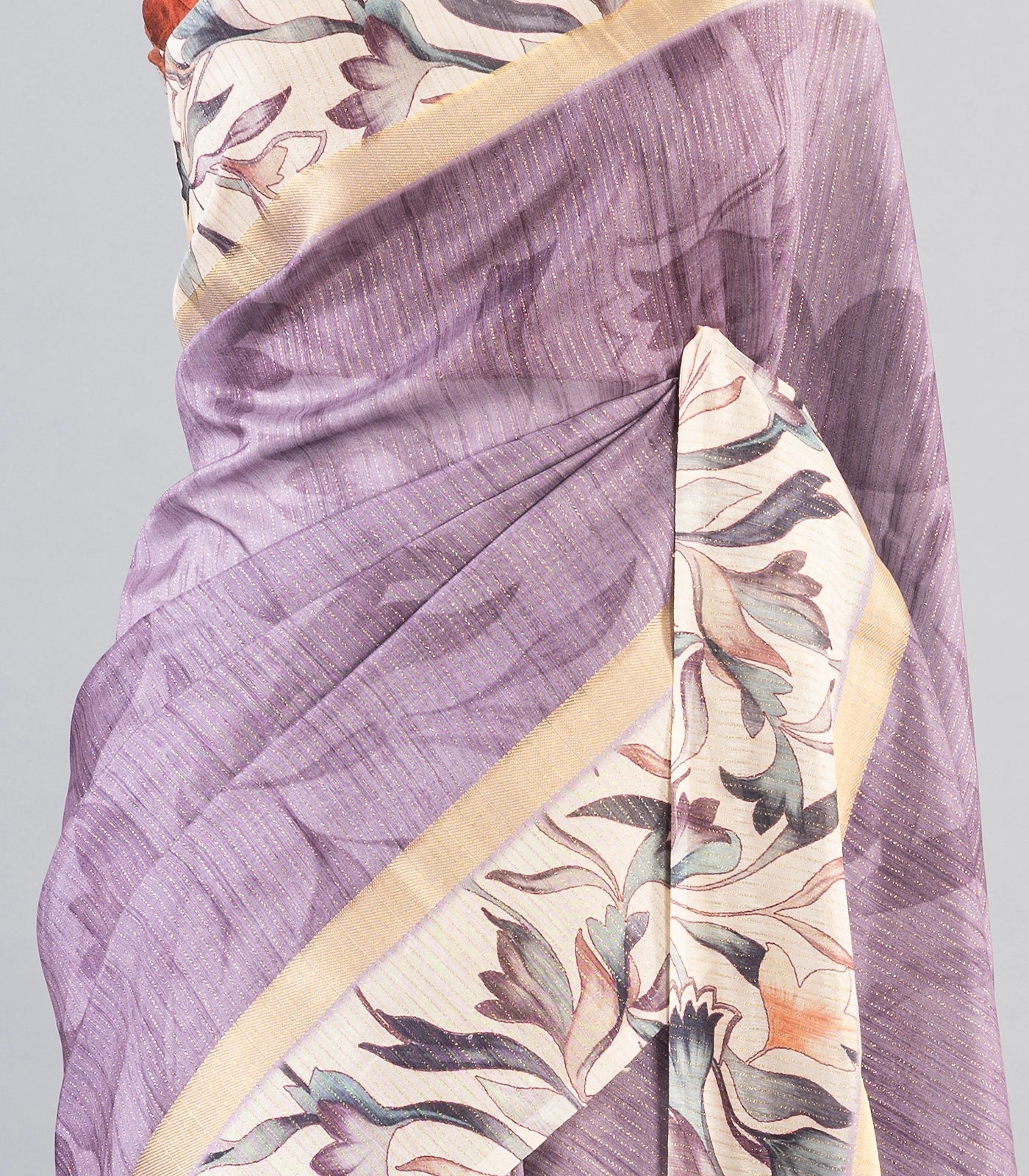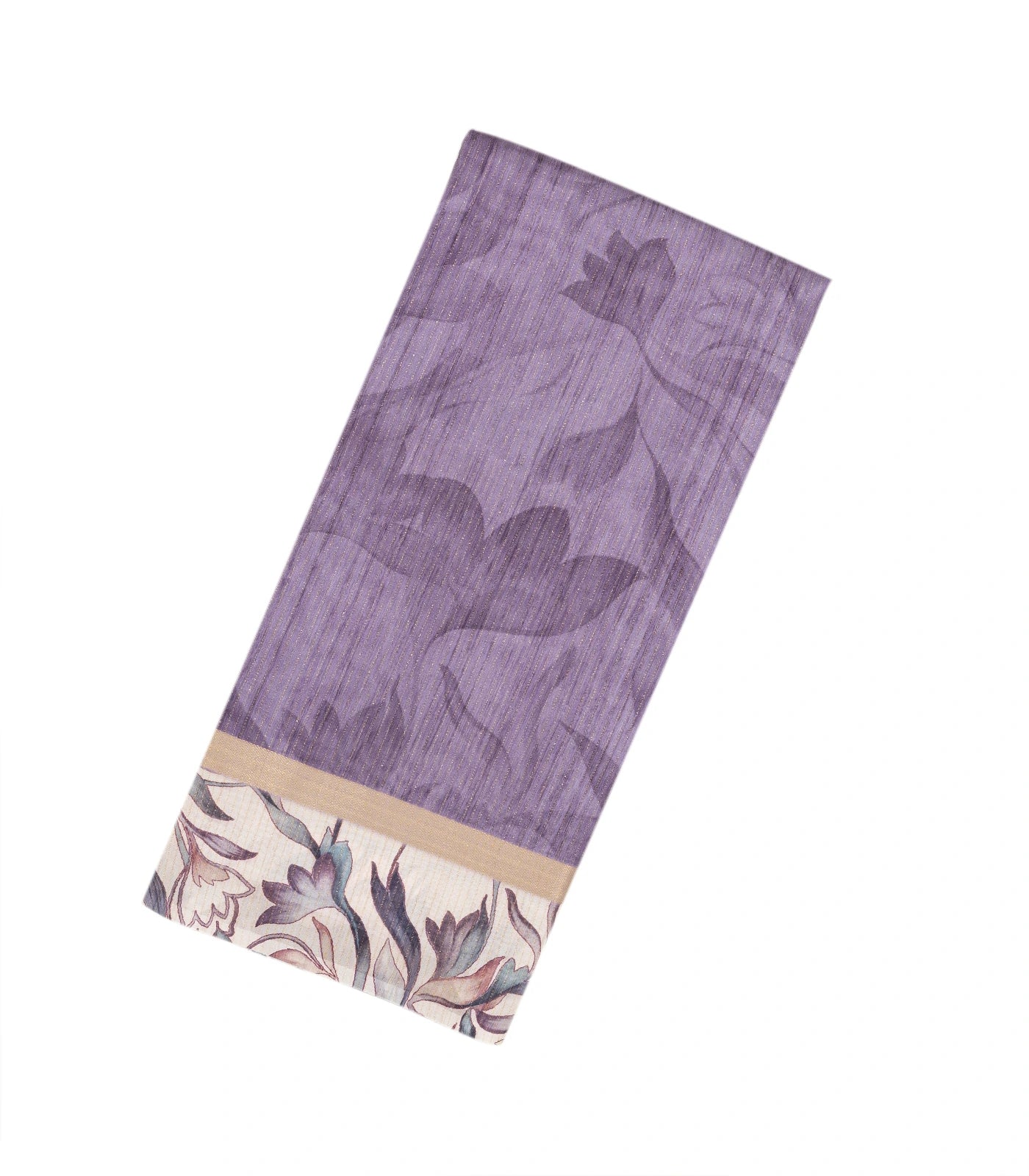 This woven art tussar saree is filled with printed floral motifs in lilac body along with zari border and pallu