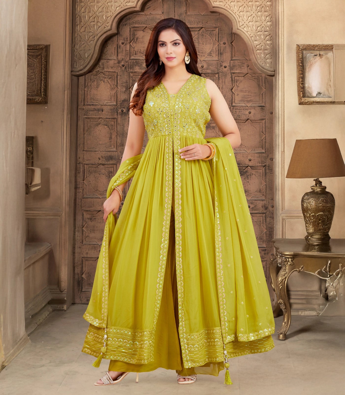 Lime Green Festive Embroidered Anarkali Set: RC5561