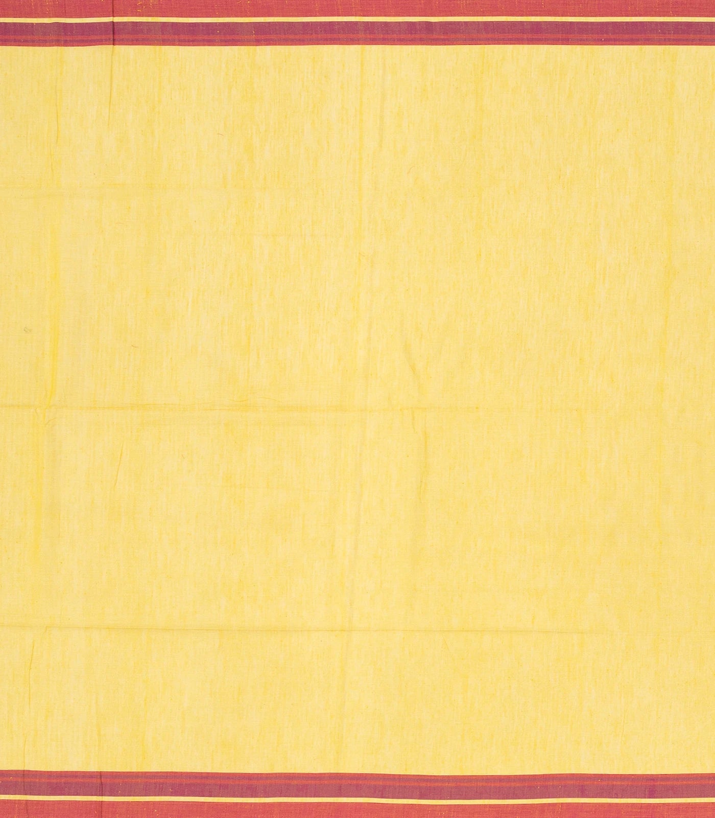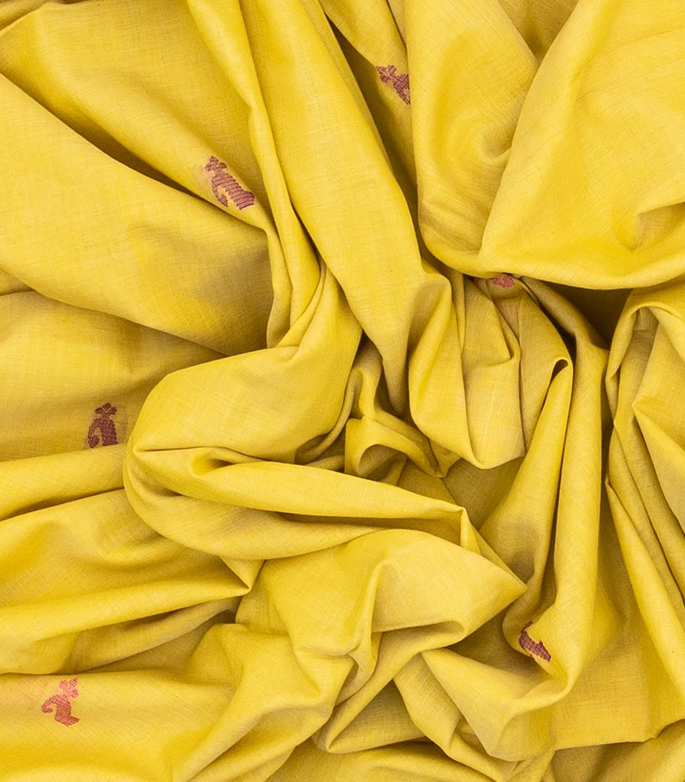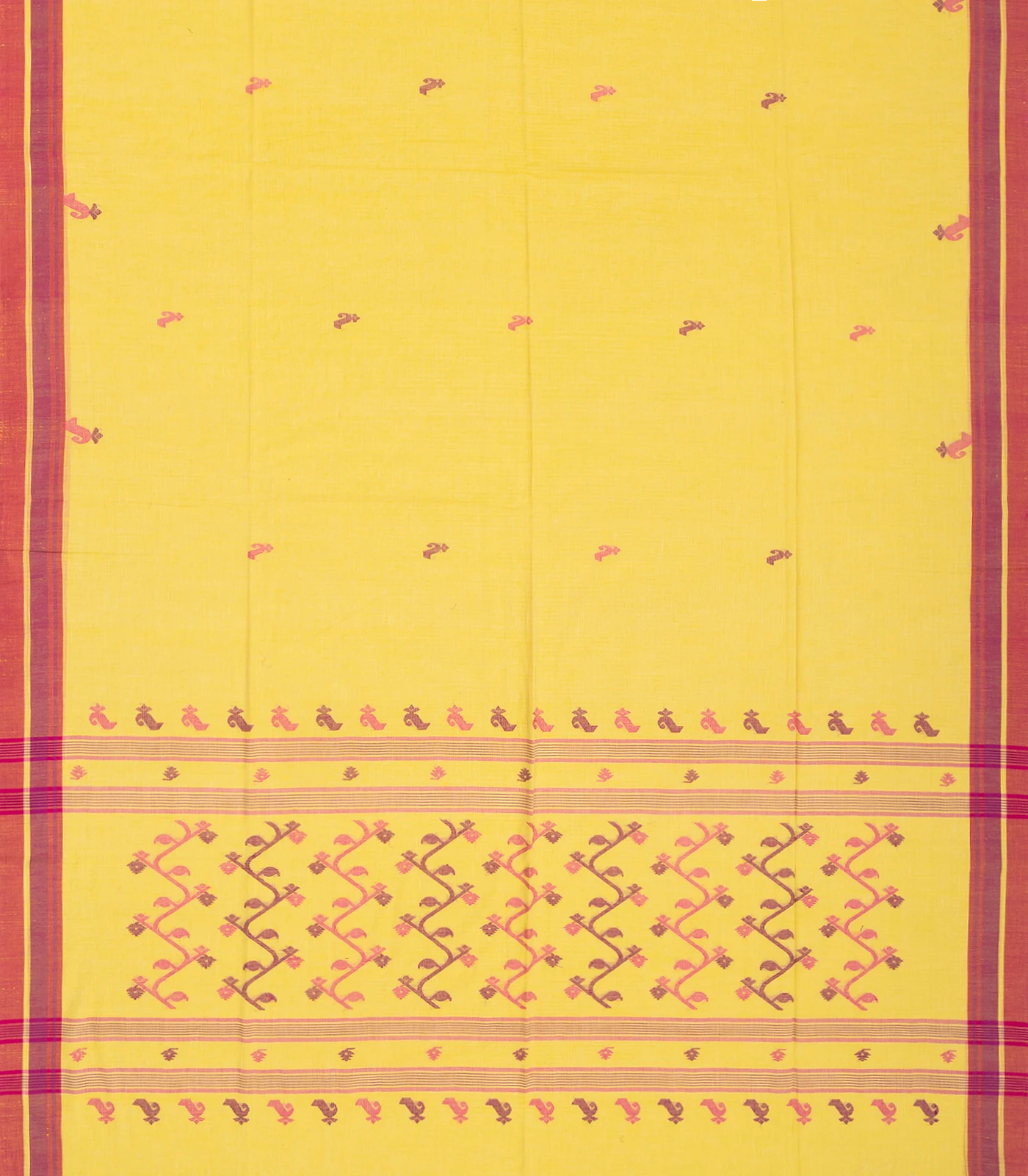 This handwoven bengal cotton saree is filled with floral buttas in lime green body along with contrast border and pallu