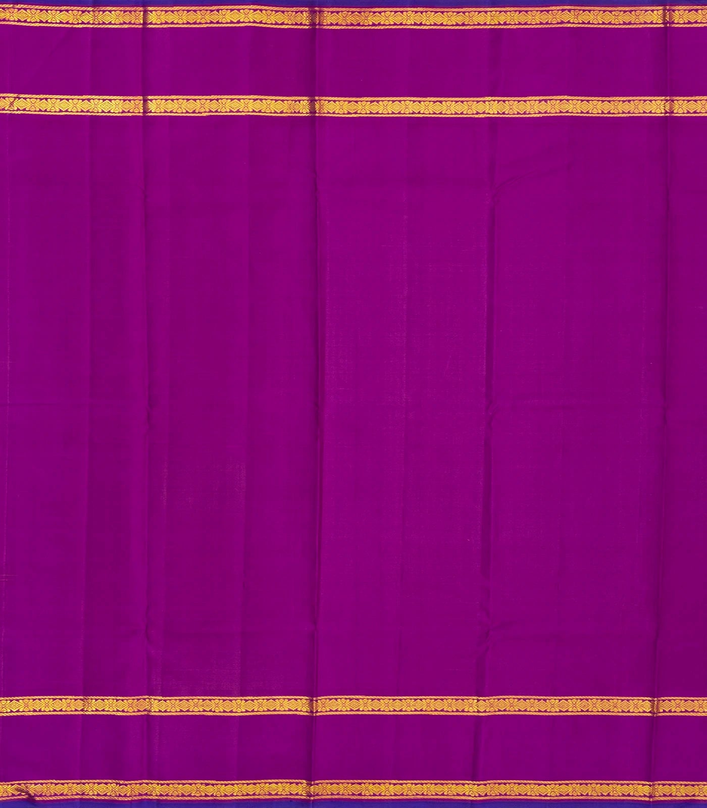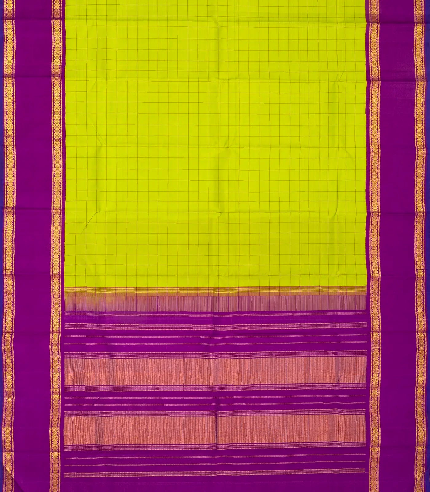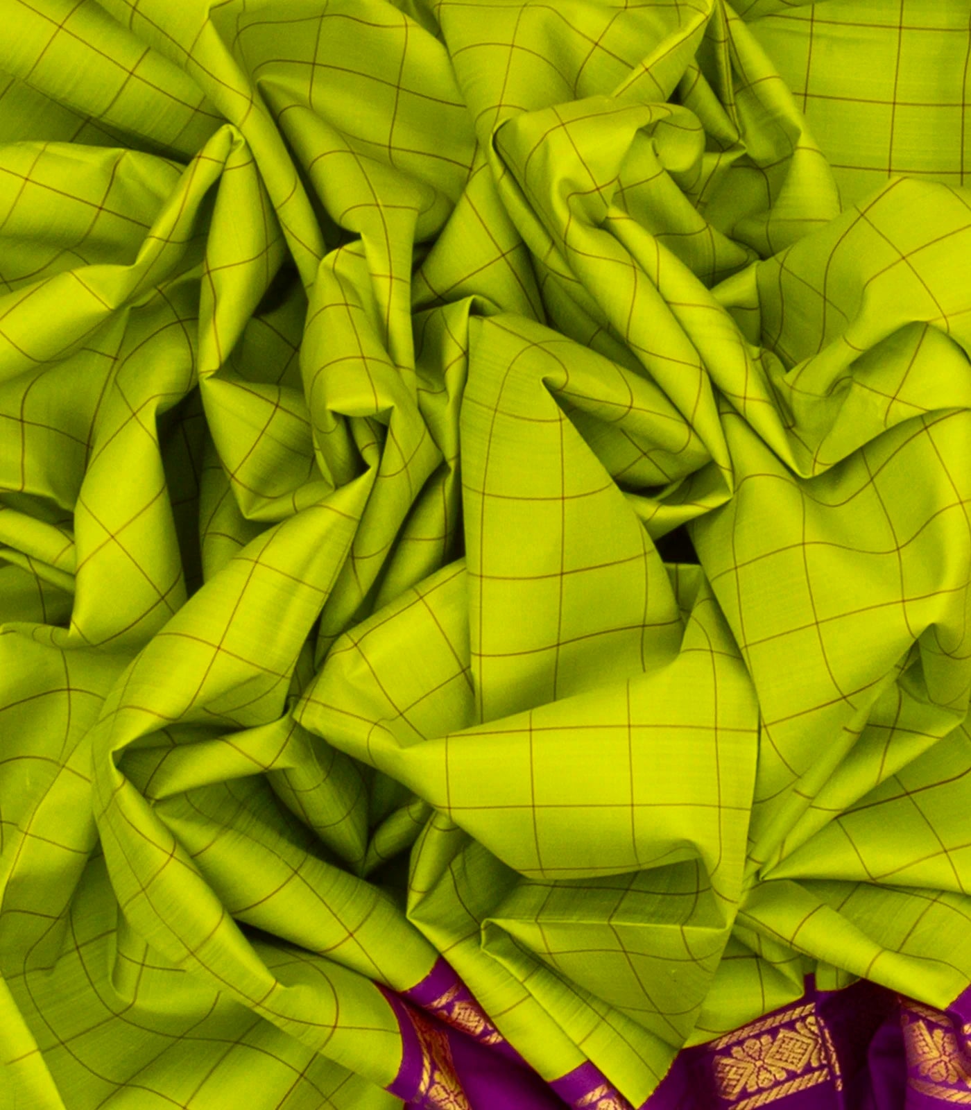 This handwoven korvai kanchipuram silk saree is filled with checks in lime green body along with contrast purple border and pallu