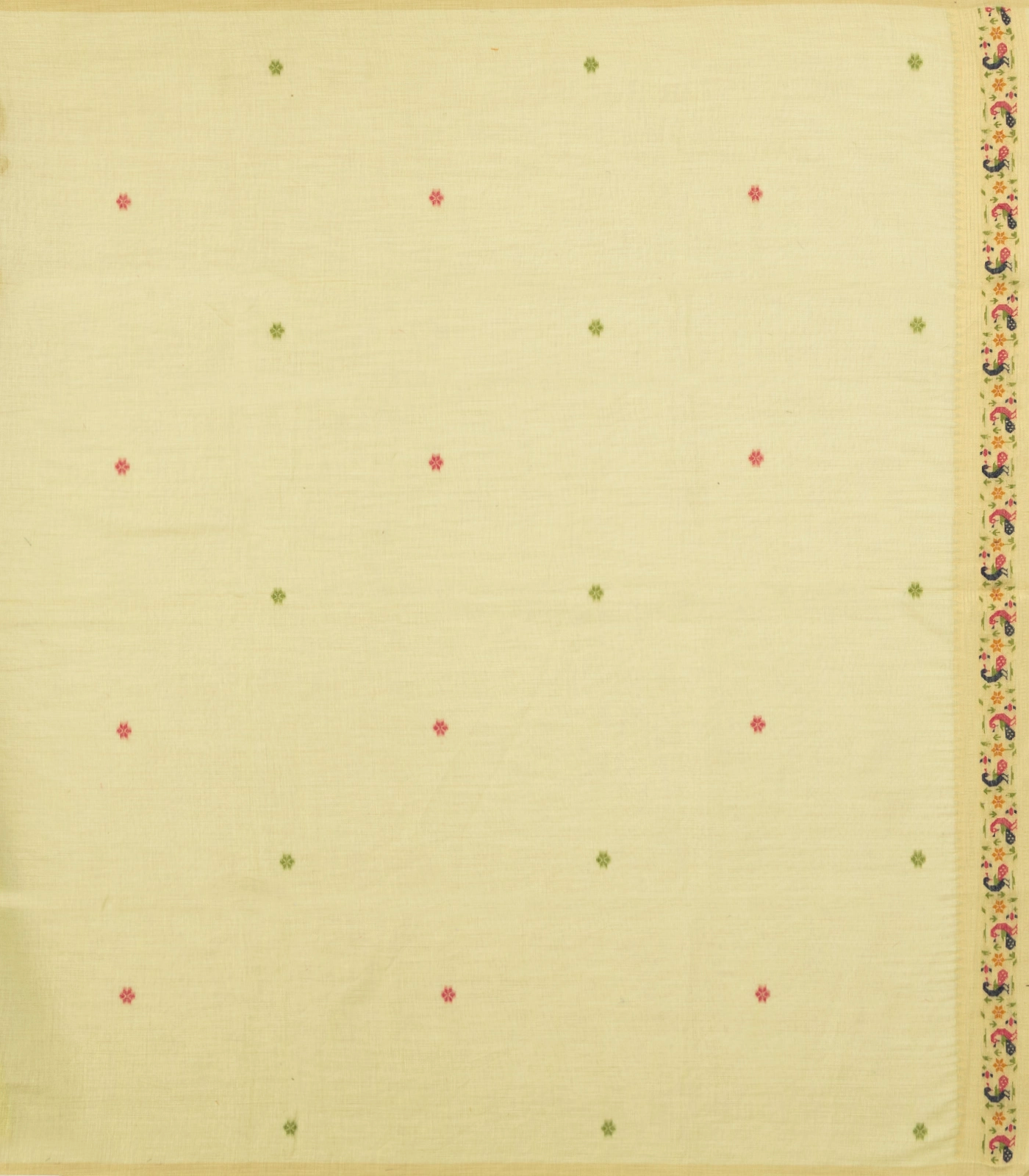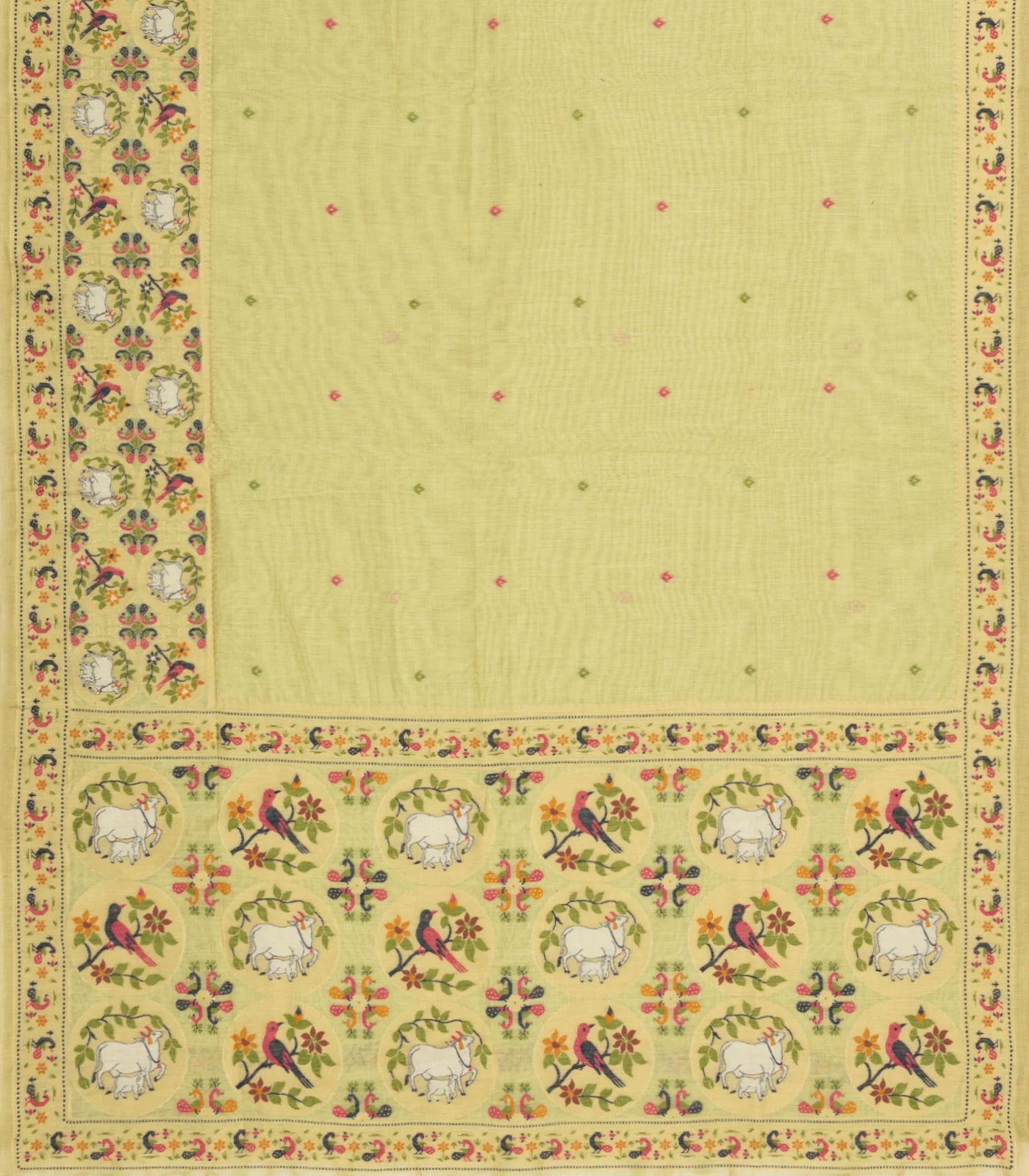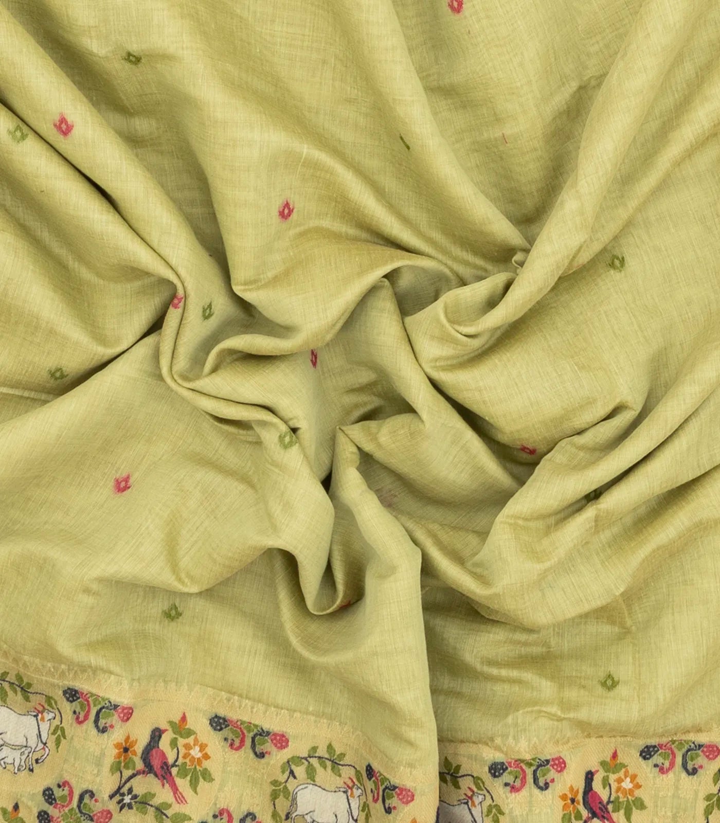 This woven blended cotton saree is filled with pichwai meena motifs in lime green body along with border and pallu