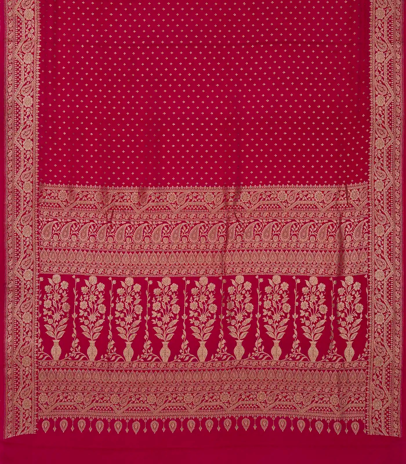 This handwoven banarasi khadi georgette silk saree filled with floral motifs in magenta body along with border and pallu
