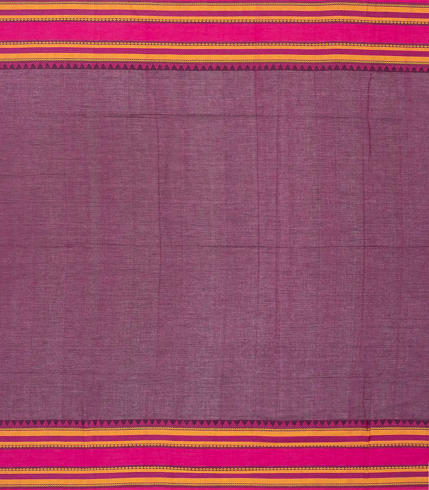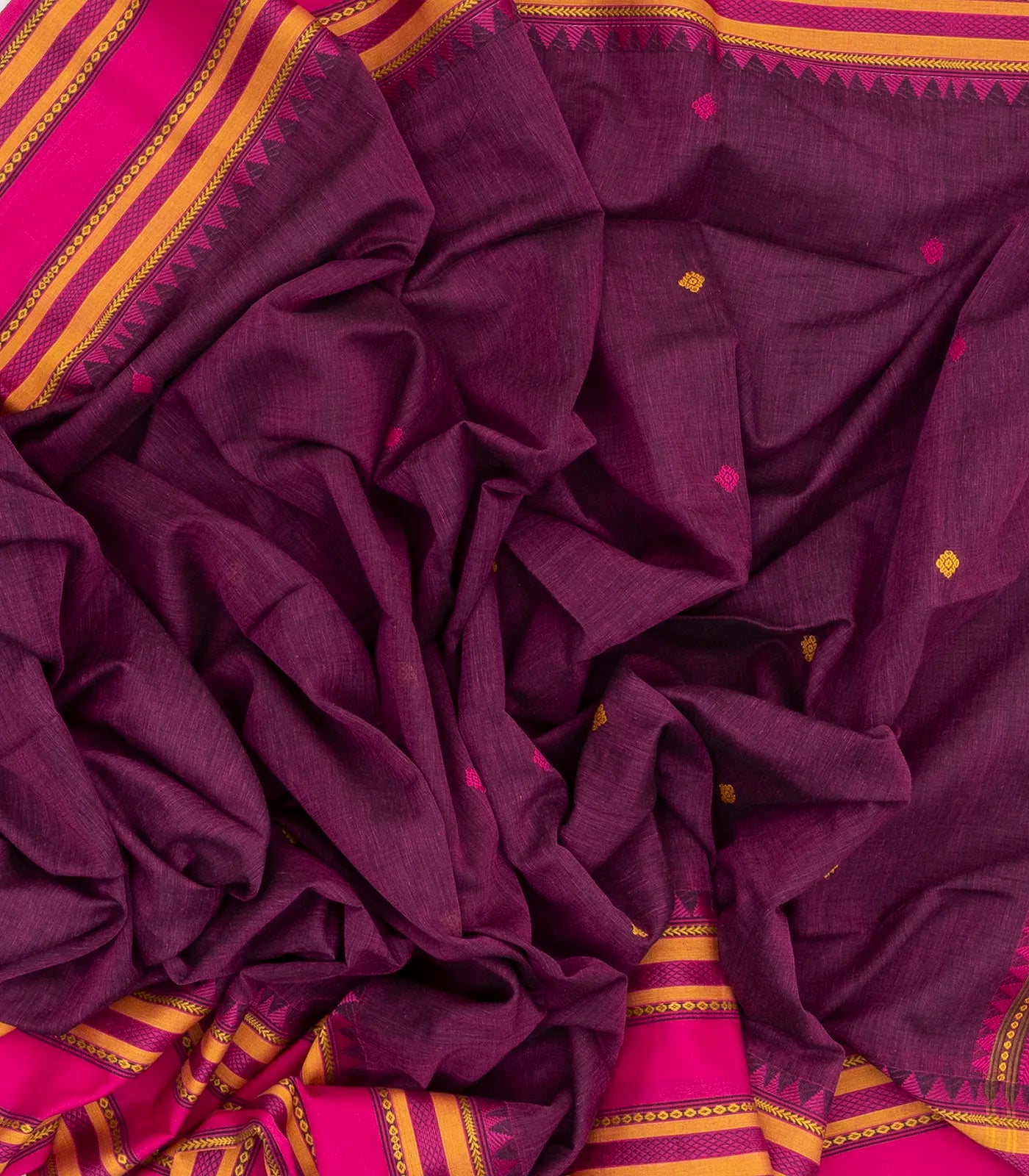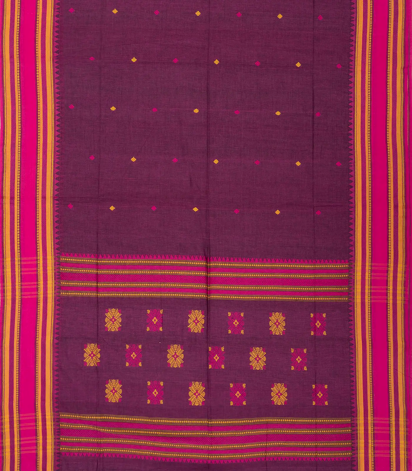 This handwoven bengal cotton saree is filled with floral buttas in magenta body along with contrast border and pallu