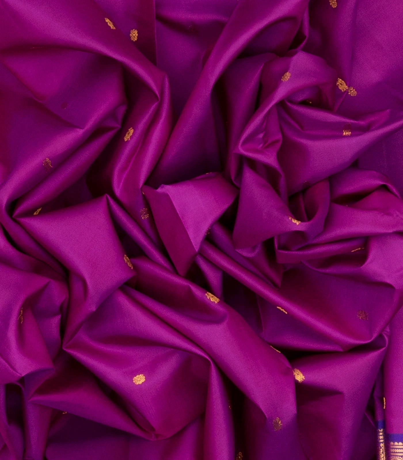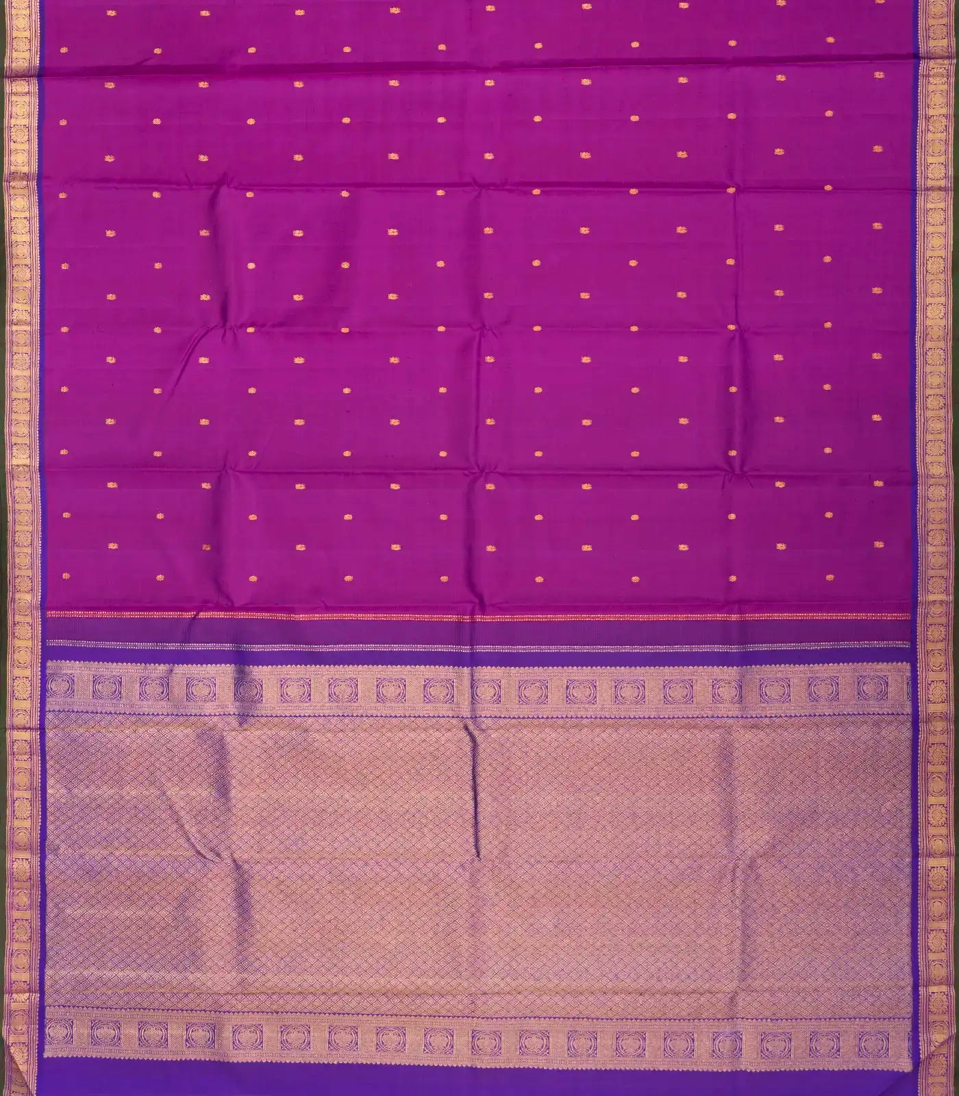 This handwoven kanchipuram silk saree is filled with annam buttas in magenta body along with contrast purple border and pallu