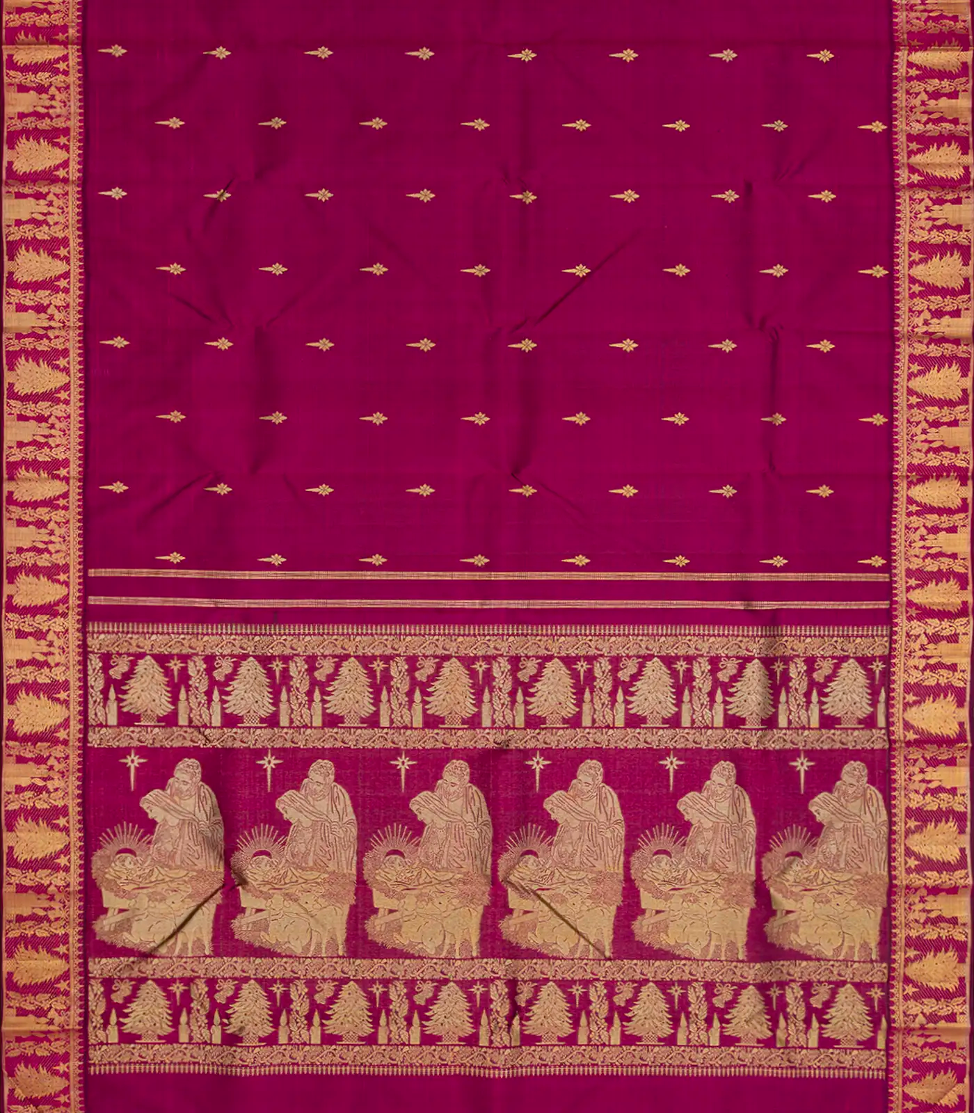 This exquisite handwoven Kanchipuram silk saree is a one-of-a-kind creation, specially curated for Christmas by the RmKV Design Studio. The vibrant magenta body is adorned with delicate Star of Bethlehem buttas, reflecting timeless elegance and traditional artistry. What sets this saree apart is its festive detailing—a beautifully woven border featuring Christmas Tree motifs, symbolizing joy and celebration, carefully crafted to capture the spirit of the season. The pallu is a masterpiece, intricately depicting the Birth of Christ, bringing together heritage weaving and the essence of Christmas in a truly unique way. Thoughtfully designed and masterfully executed, this saree is a celebration of faith, festivity, and fine craftsmanship.