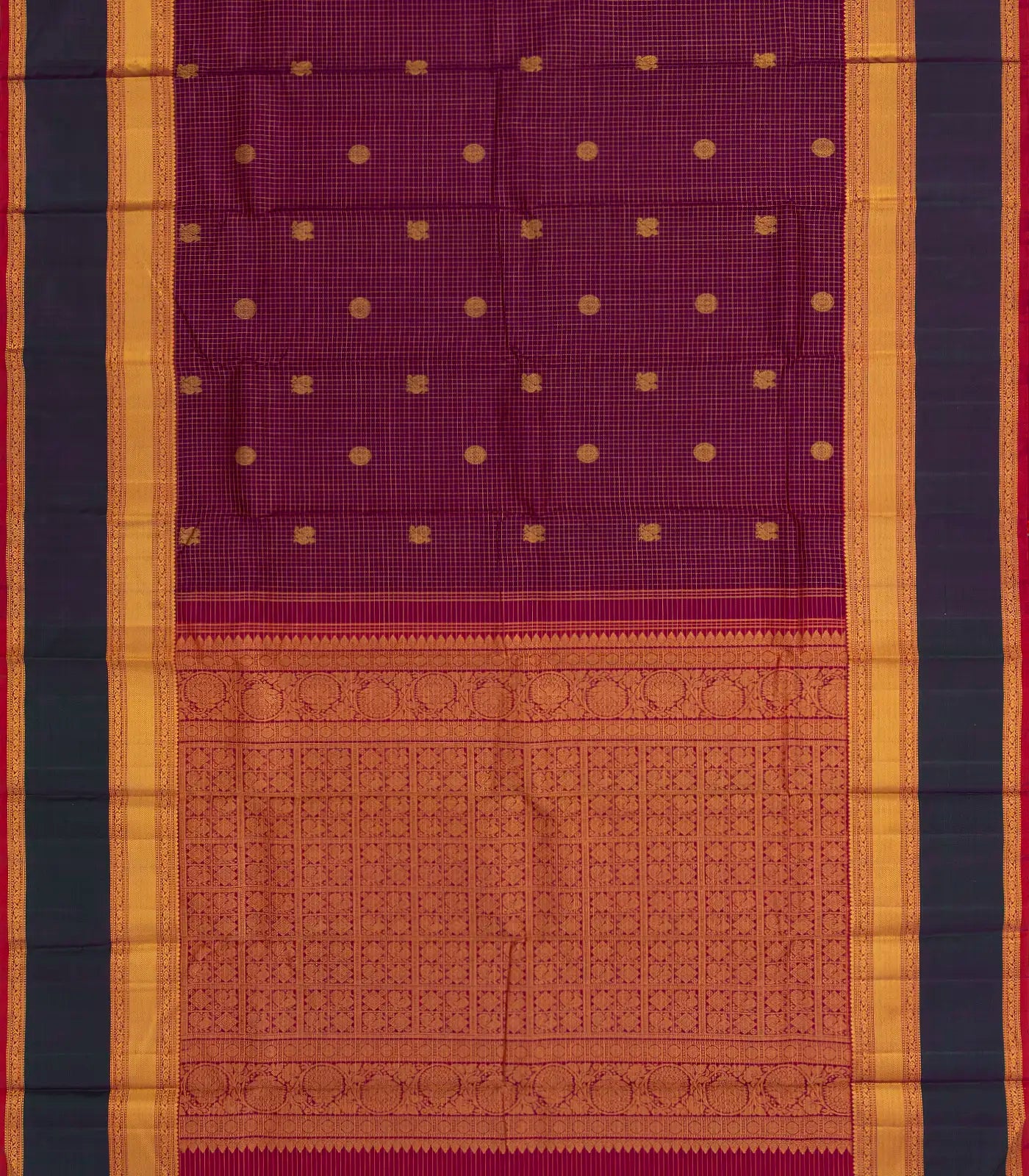 This handwoven kanchipuram silk saree is filled with zari checks in magenta body along with contrast zari border and pallu