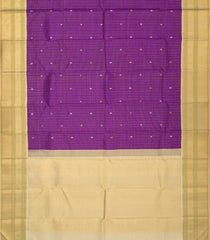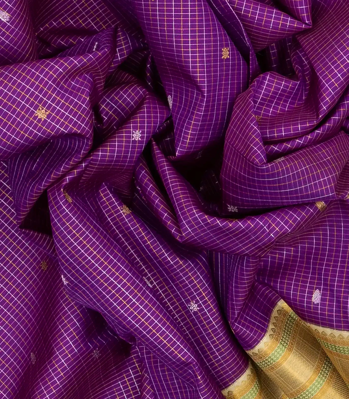 This handwoven korvai kanchipuram silk saree is filled with checks & buttas in magenta body along with contrast border and pallu