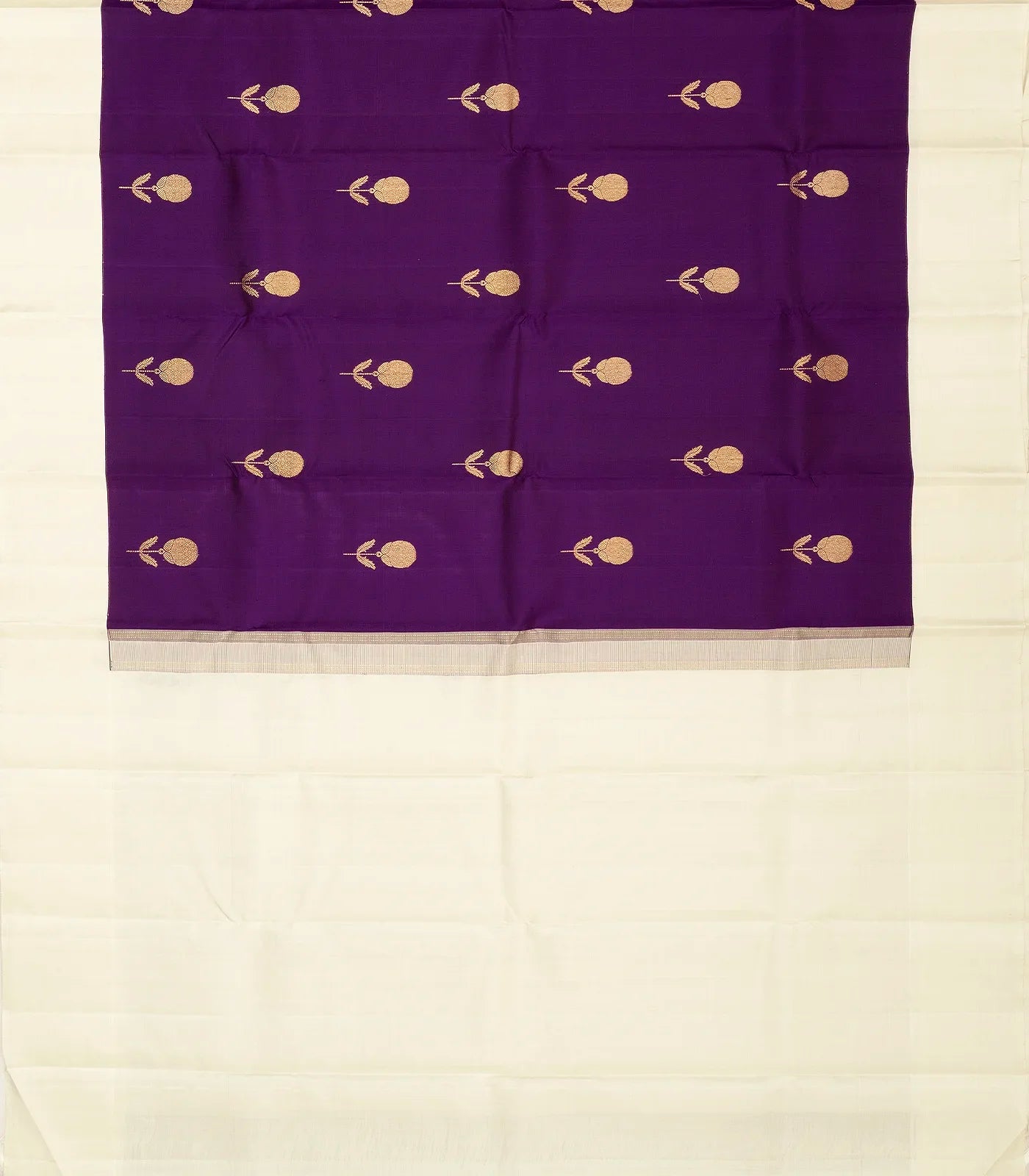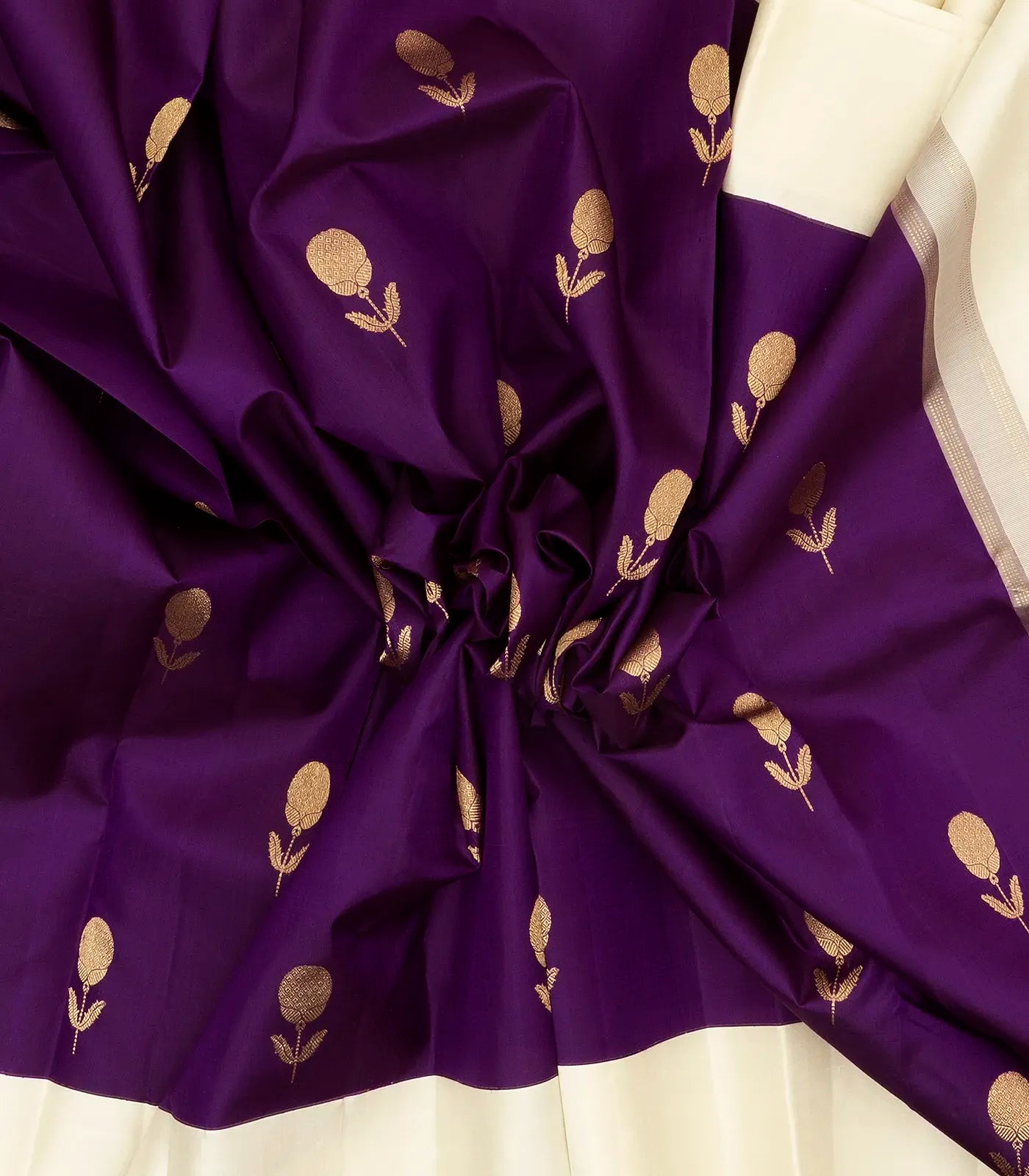 This handwoven korvai kanchipuram silk saree is filled with floral buttas in magenta body along with zari border and pallu