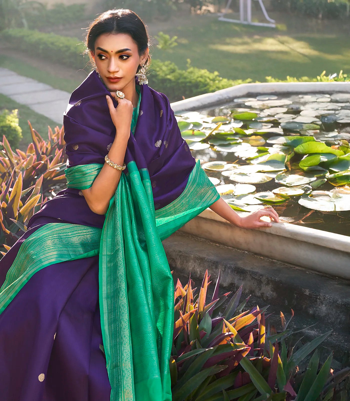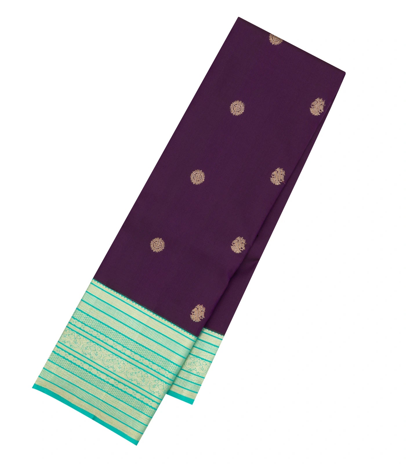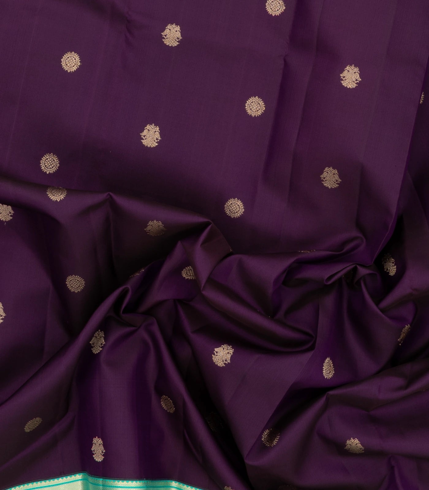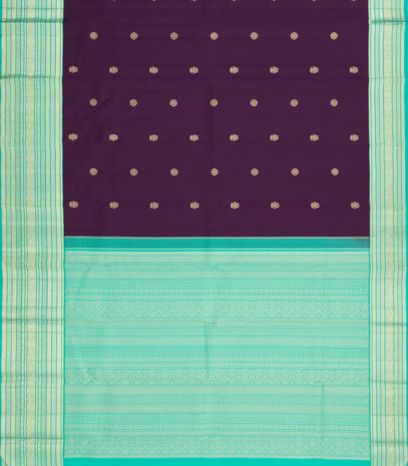 This handwoven korvai kanchipuram silk saree is filled with gandaberunda buttas in magenta body along with contrast border and pallu