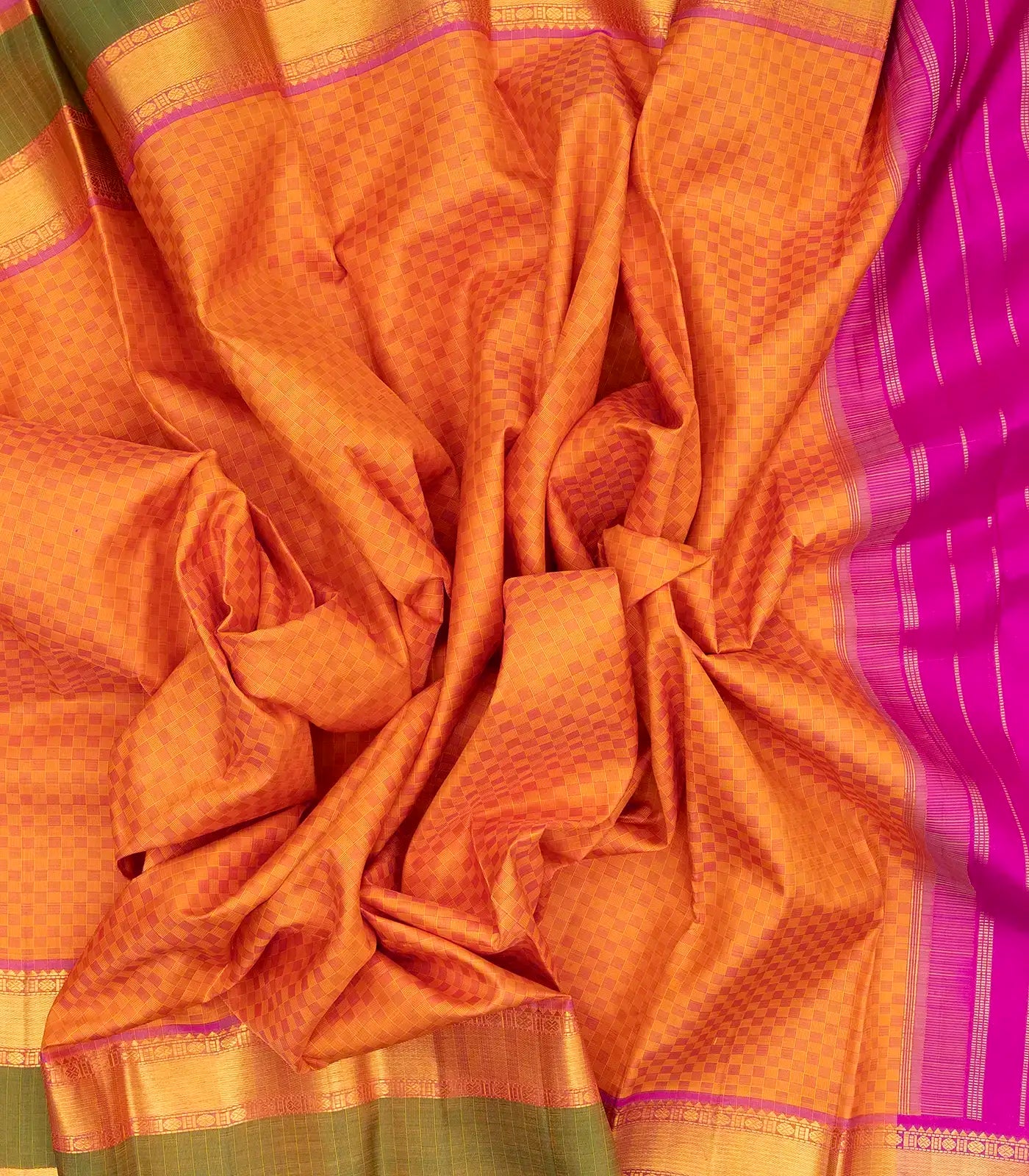 This handwoven kanchipuram silk saree is filled with payadi checks in mango yellow body along with contrast zari border and pallu
