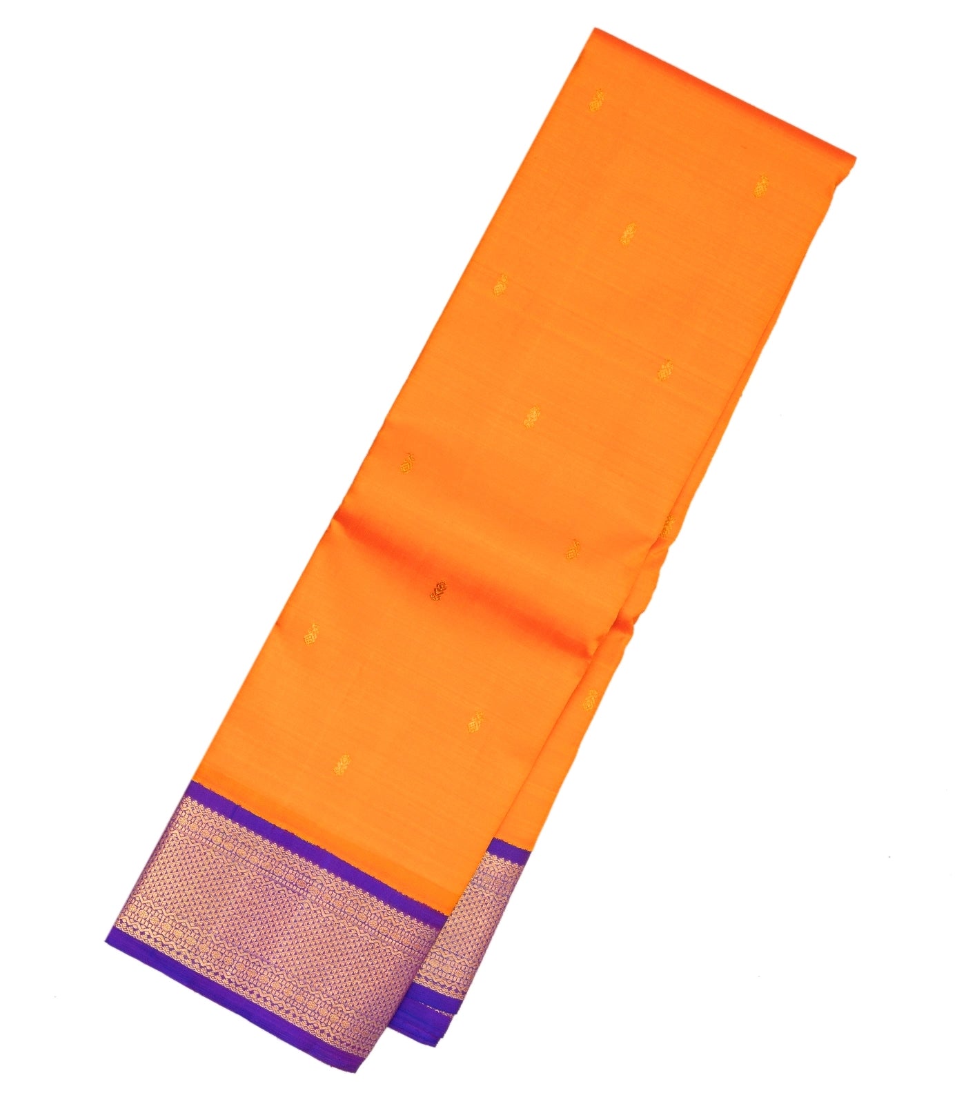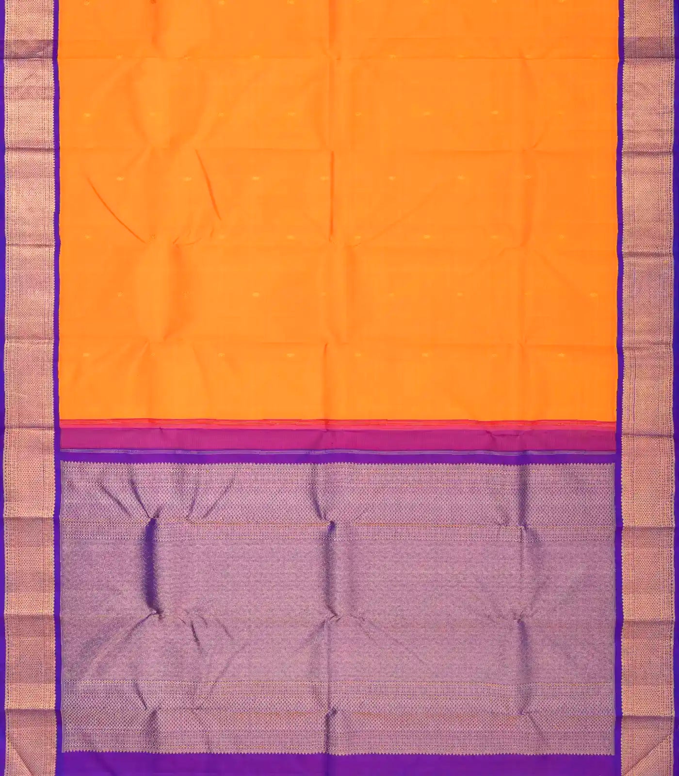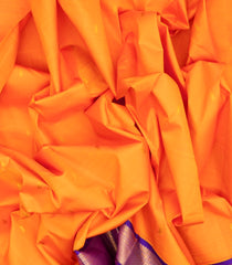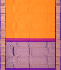 This handwoven korvai kanchipuram silk saree is filled with floral buttas in mango yellow body along with contrast purple border and pallu