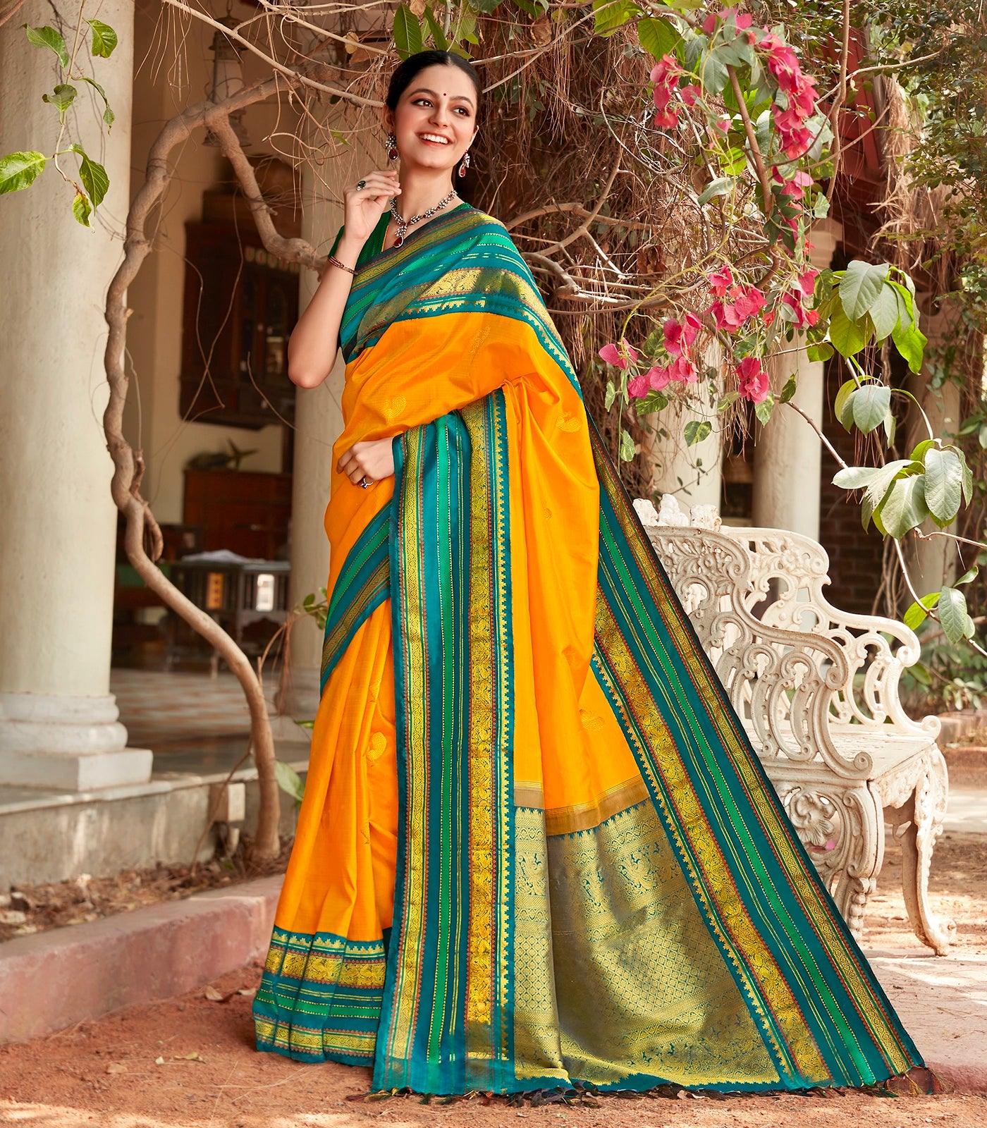 This handwoven korvai kanchipuram silk saree is filled with annam zari buttas in mango yellow body along with contrast green border and pallu