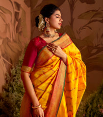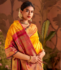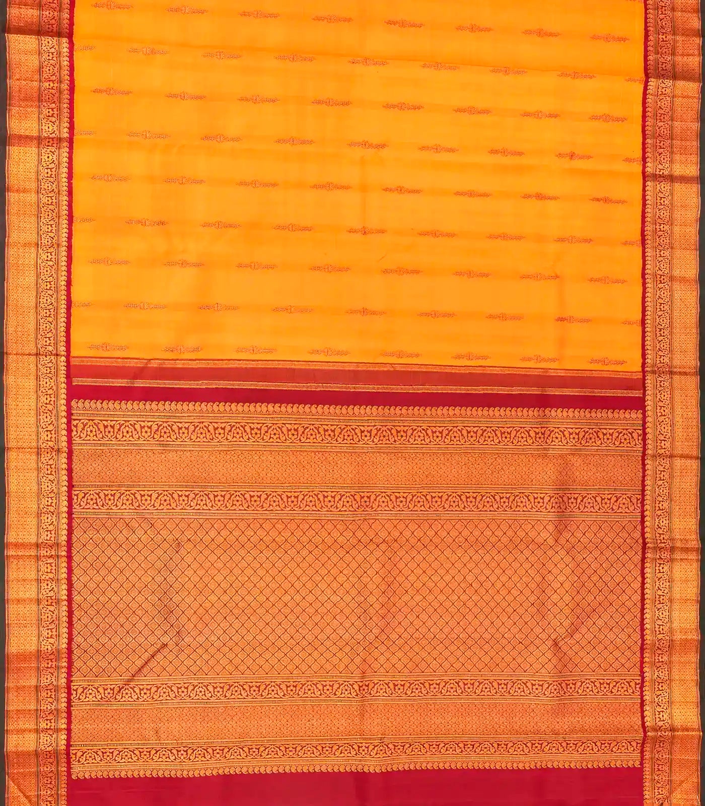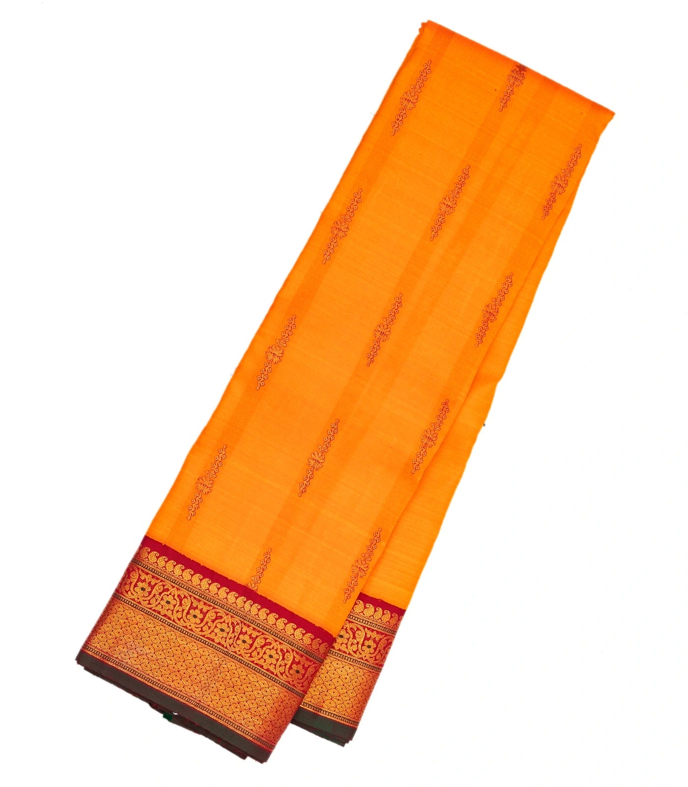 Steeped in tradition and woven with the finesse of heritage craftsmanship, this exquisite Korvai saree embodies the vibrancy of South Indian culture. The saree’s mambazham-hued body, a luscious blend of golden yellow and orange, is achieved through the meticulous interplay of an orange warp and yellow weft, creating the perfect ripened mango shade—a color deeply rooted in auspiciousness and bridal grandeur. Delicately scattered across this luminous canvas are decorated lotus flower buttas, each one woven with pure golden zari threads and accentuated by crimson meena silk outlines, giving the motifs a striking definition that mirrors the radiance of a blooming lotus at sunrise.