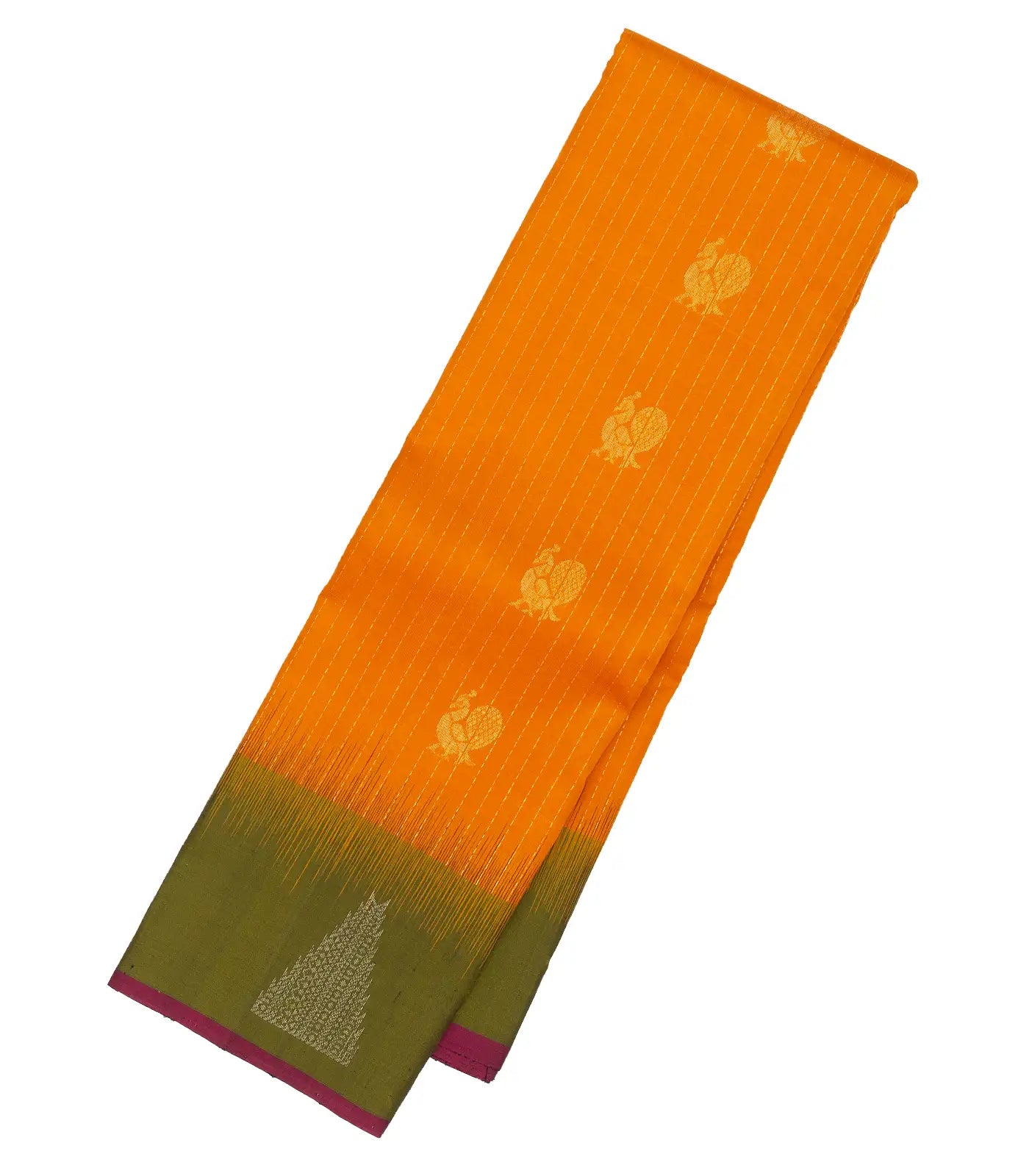 This handwoven soft silk saree is filled with zari buttas in mango yellow body along with contrast border and pallu