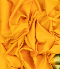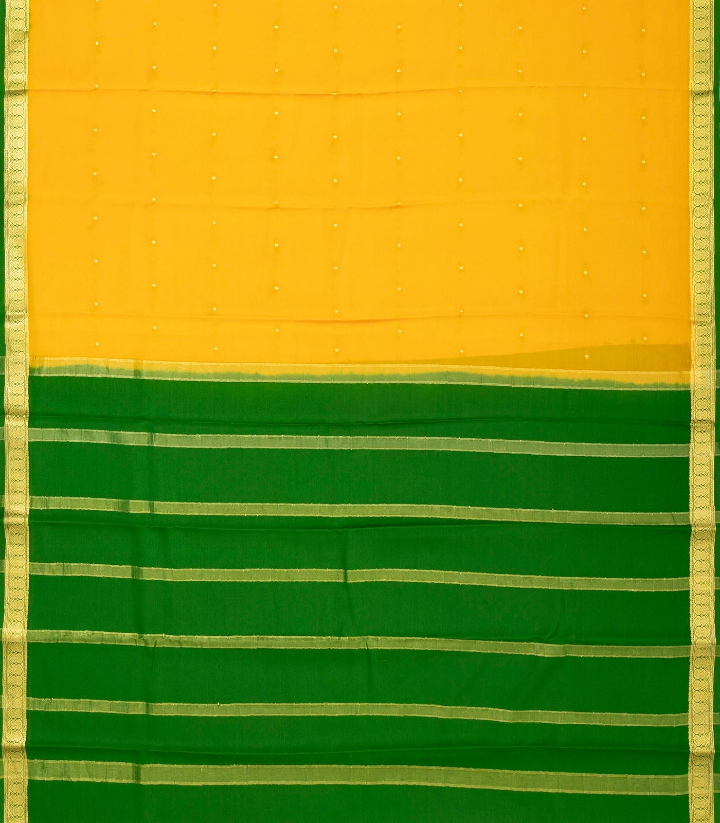This woven mysore crepe silk saree is filled with coin buttas in mango yellow body along with contrast green border and pallu