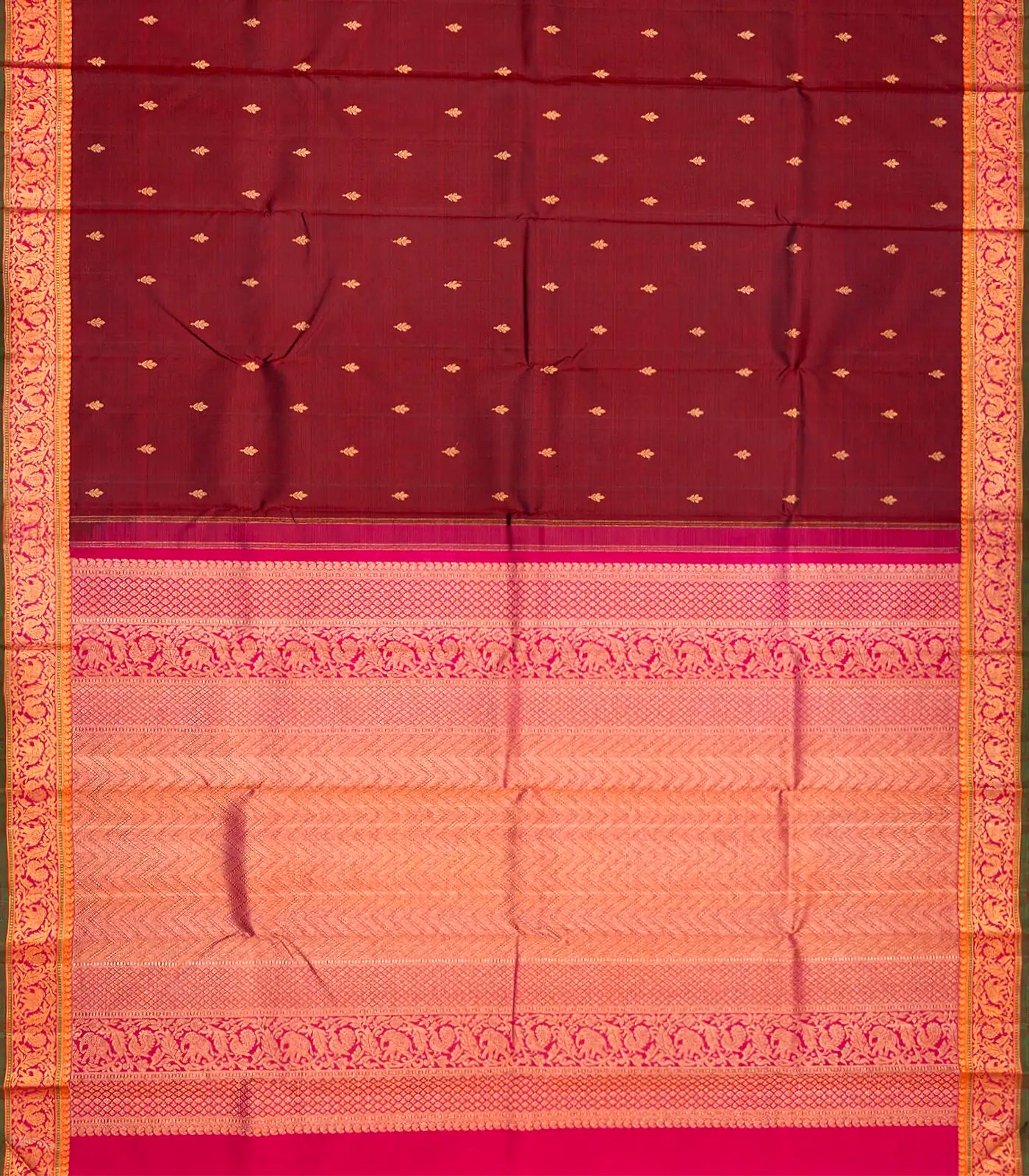 This handwoven kanchipuram silk saree is filled with floral buttas in maroon body along with contrast zari border and pallu