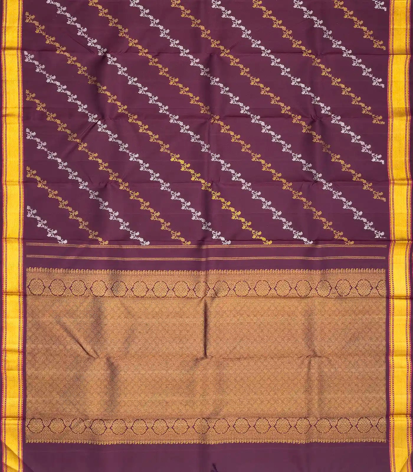 This handwoven kanchipuram silk saree filled with floral vine motifs in maroon body along with zari border and pallu