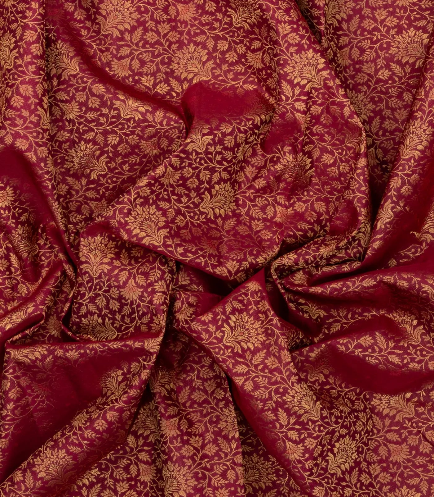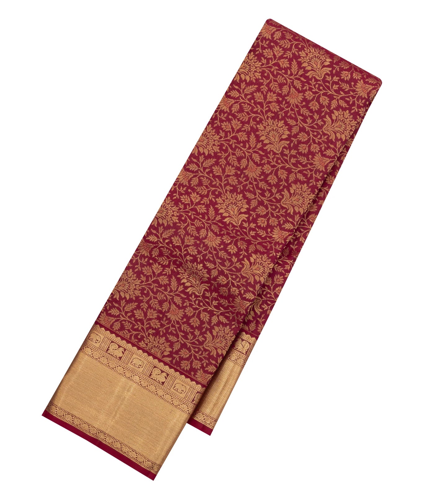 This handwoven kanchipuram silk saree is filled with floral vine motifs in maroon body along with zari border and pallu