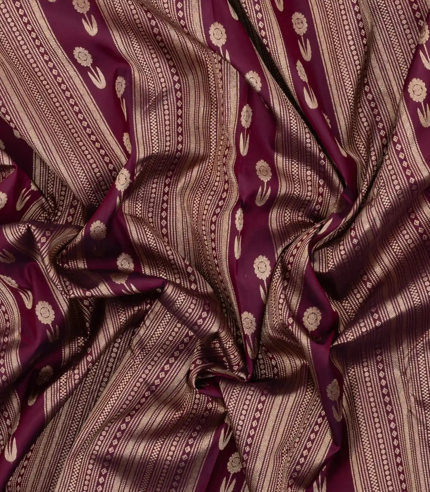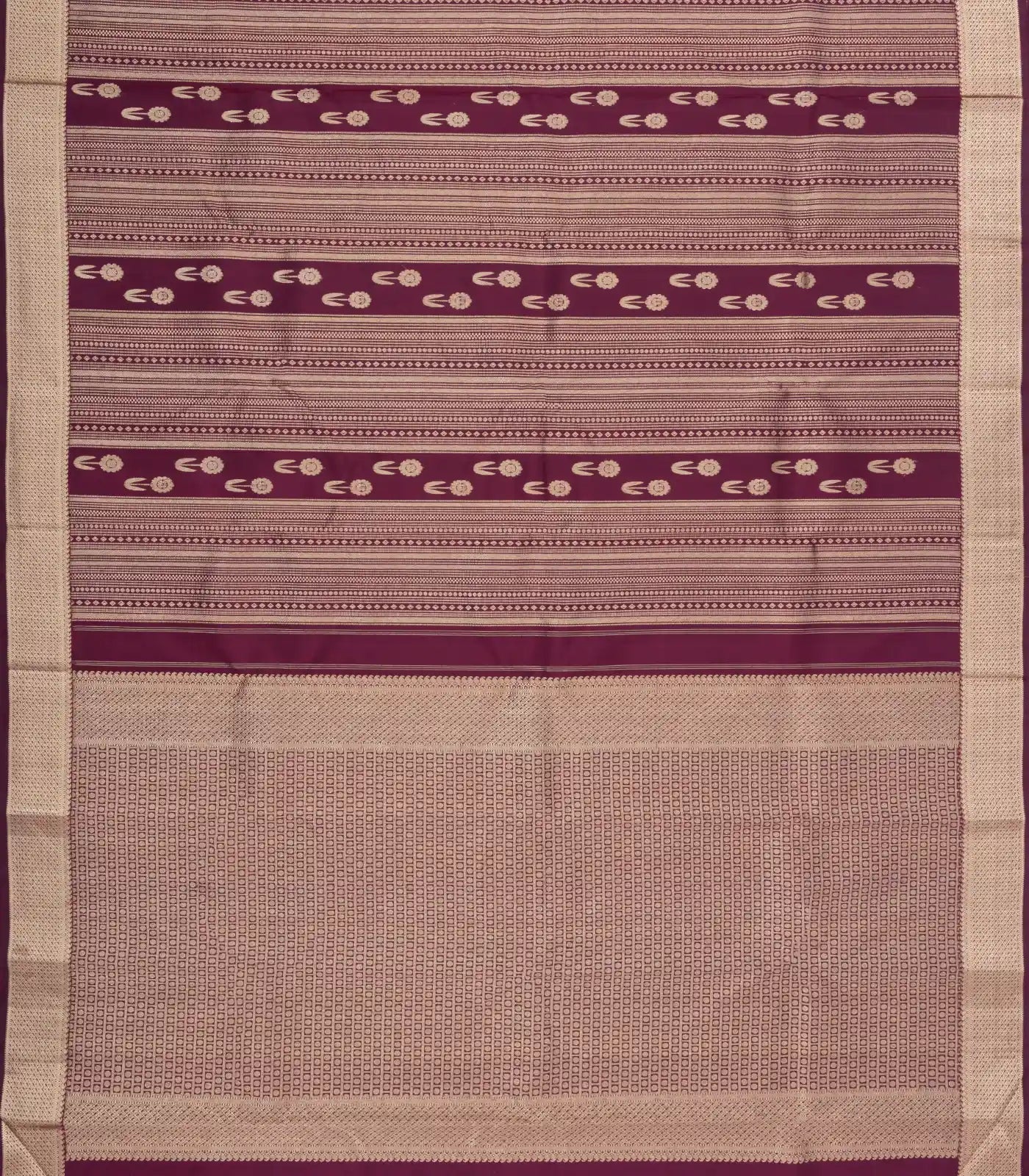 This handwoven kanchipuram silk saree is filled with stripes & buttas in maroon body along with zari border and pallu
