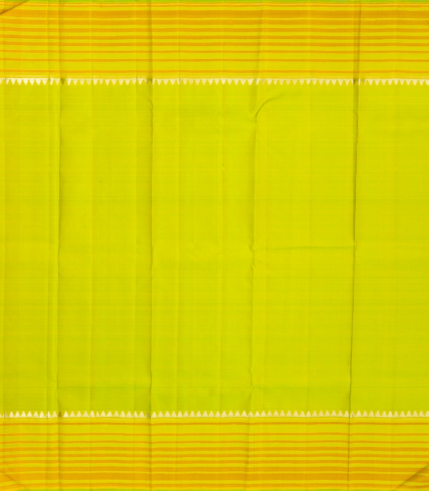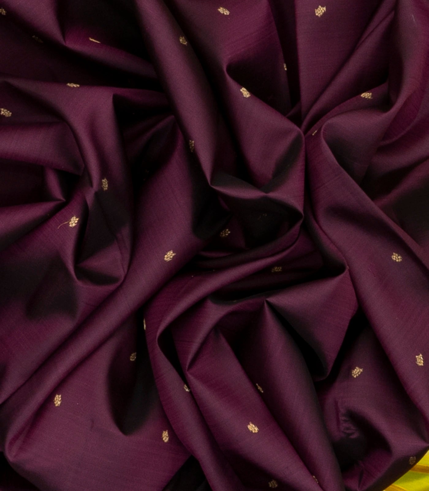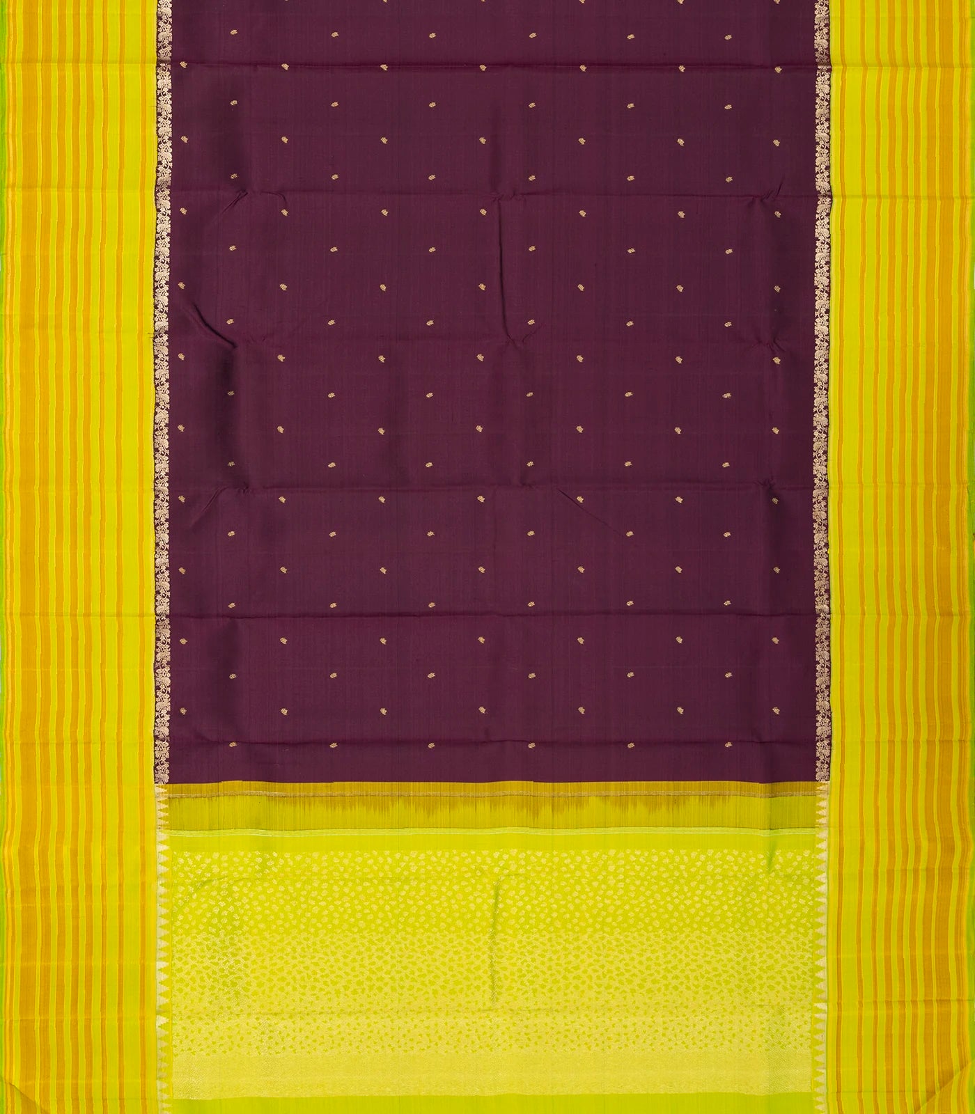 This handwoven korvai kanchipuram silk saree is filled with floral buttas in maroon body along with contrast lime green zari border and pallu