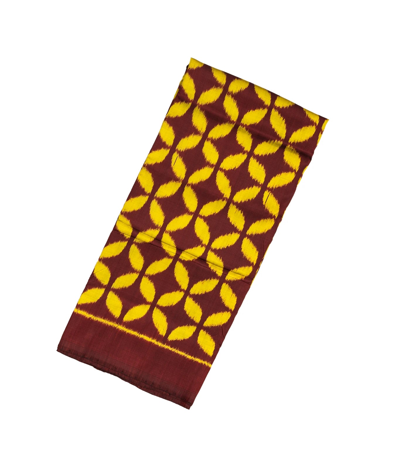 This handwoven Orissa silk saree is filled with tie & dye jaal motifs in maroon body along with plain border and pallu
