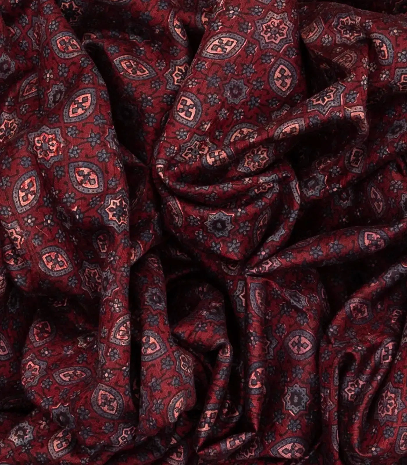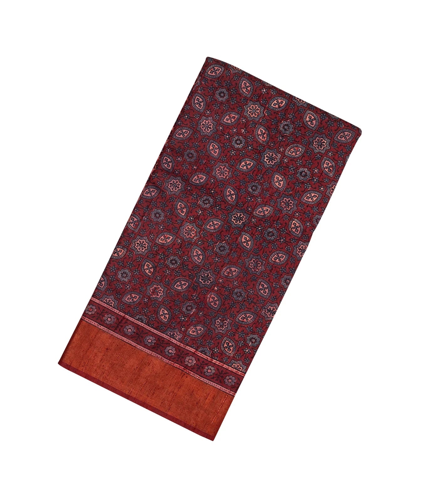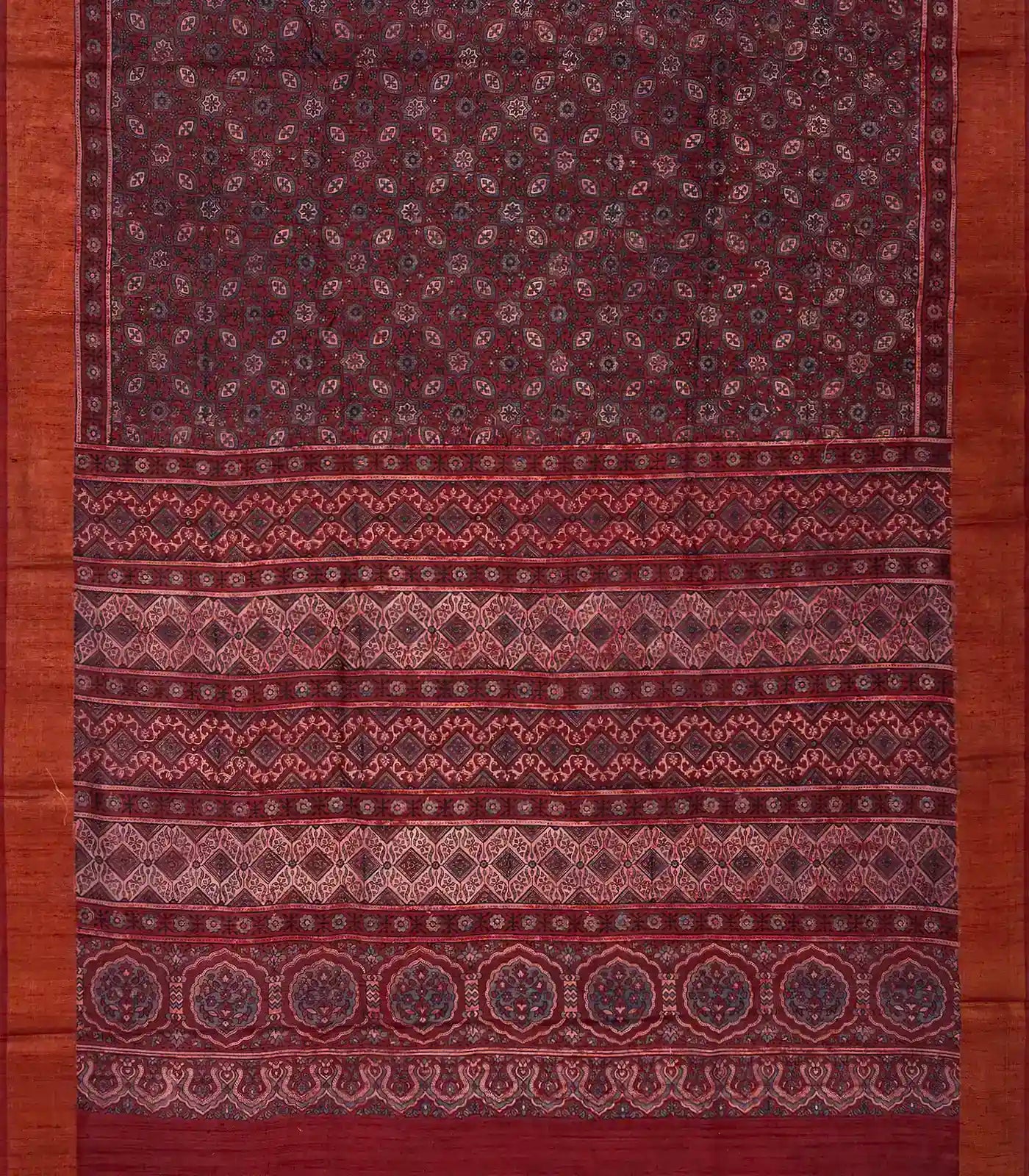 This handwoven tussar silk saree is filled with printed floral jaal motifs in maroon body along with contrast border and pallu