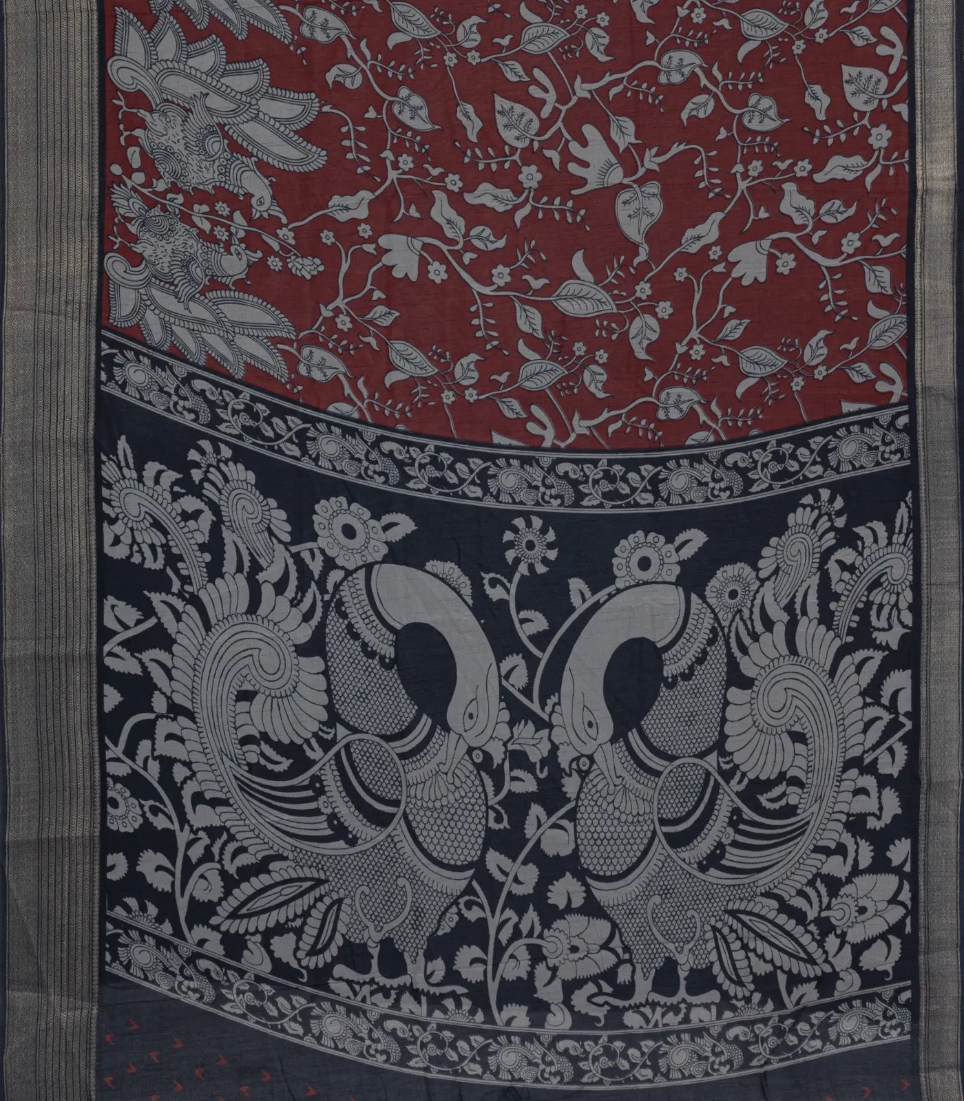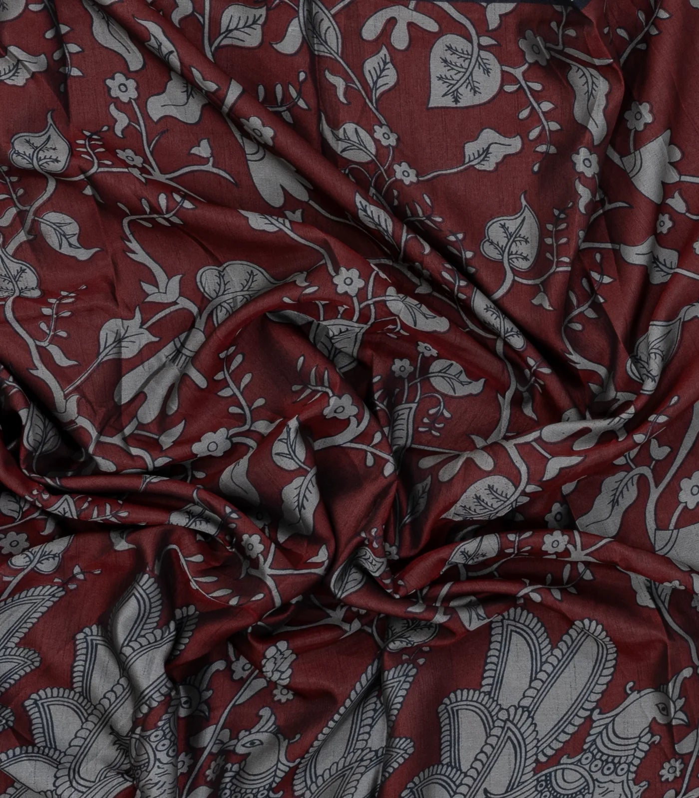 This woven art tussar saree is filled with printed motifs in maroon body along with contrast border and pallu