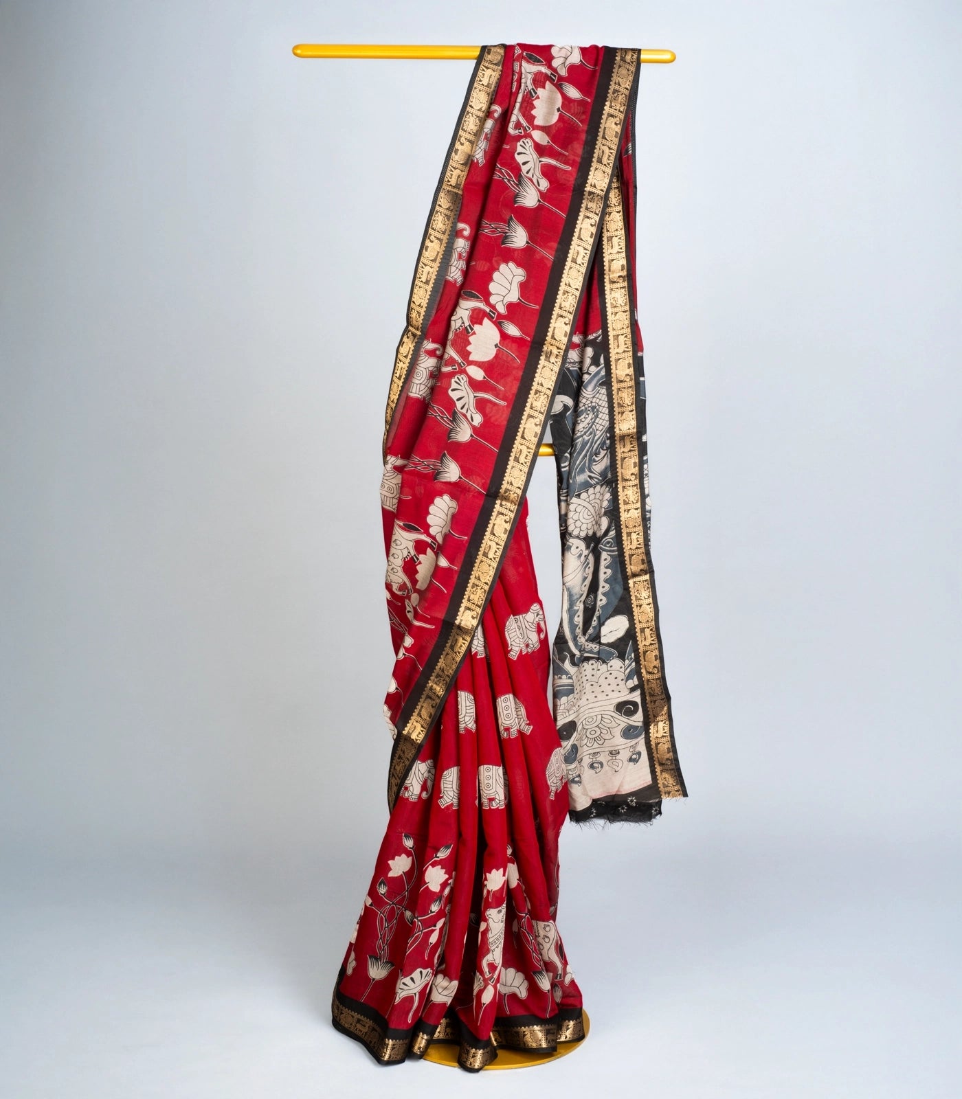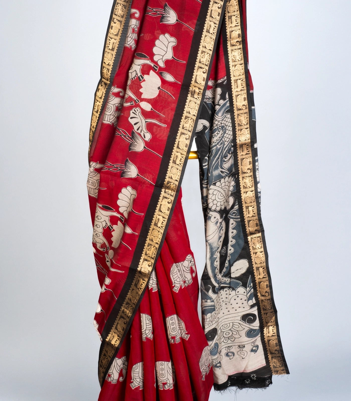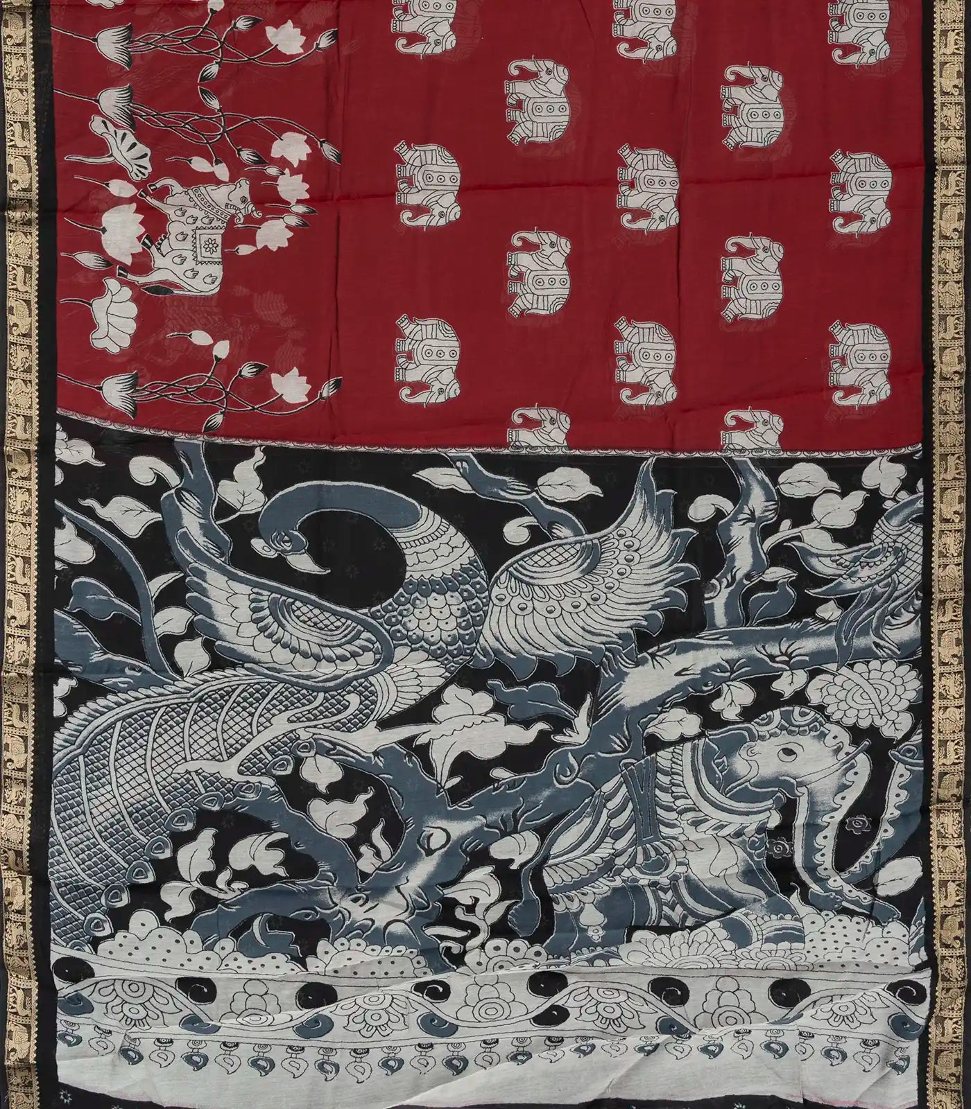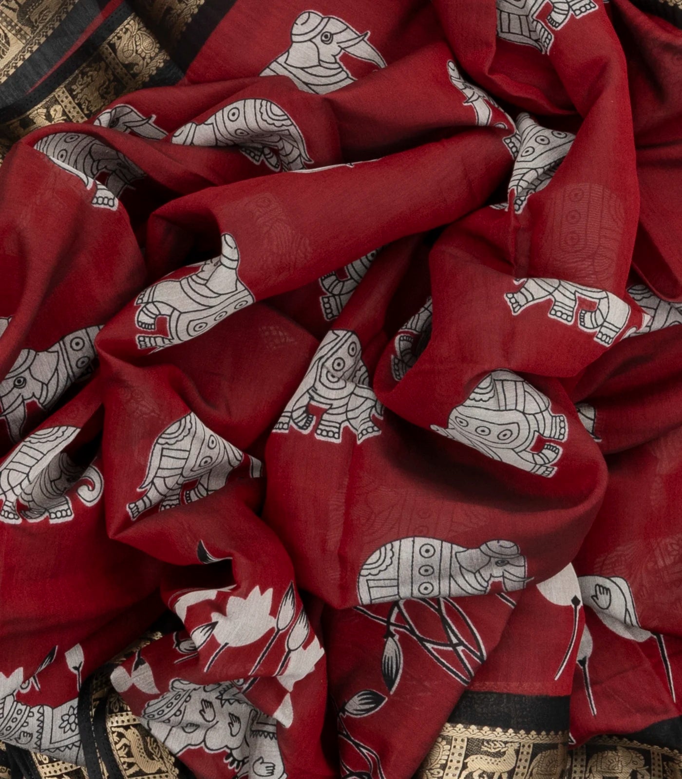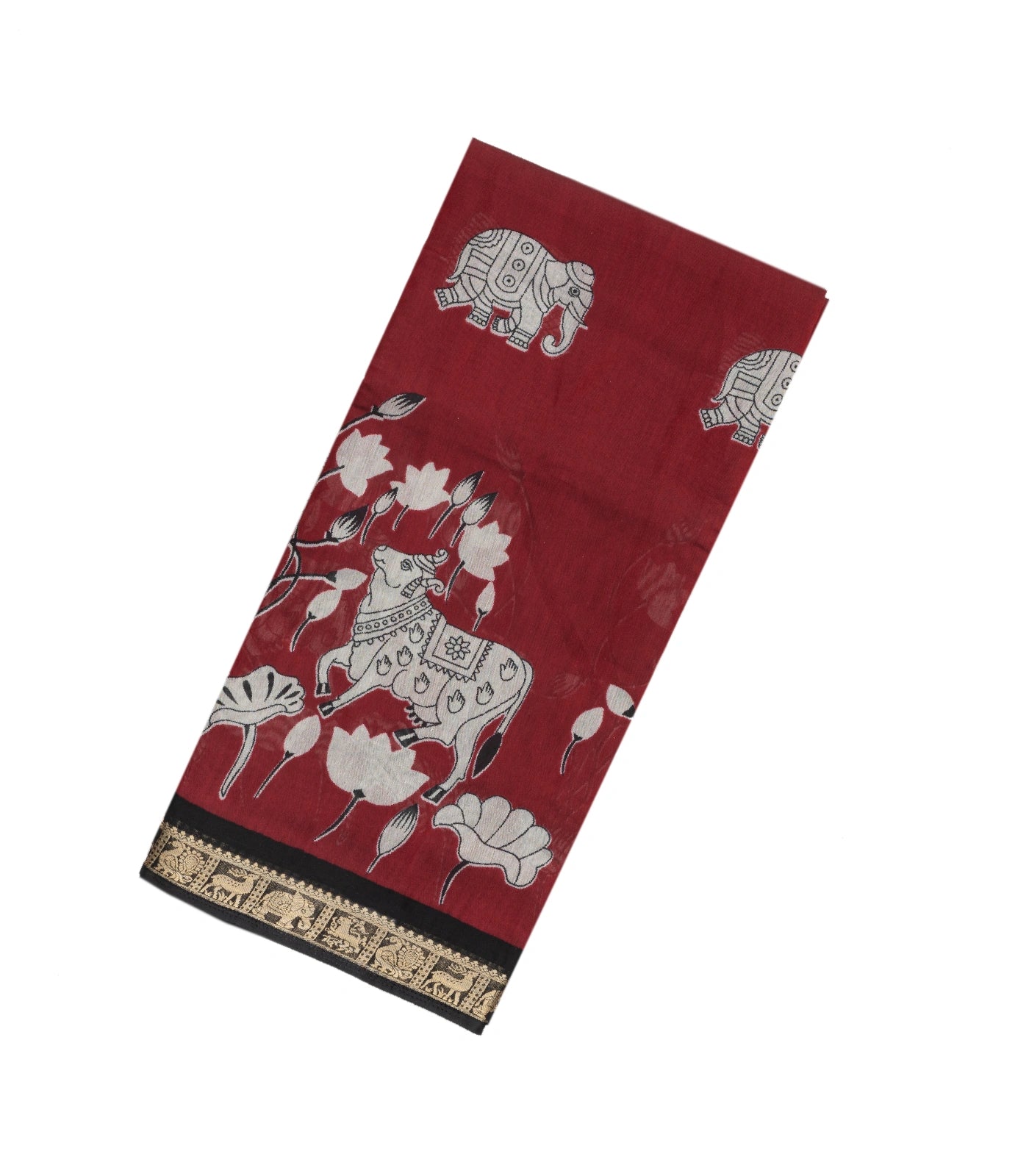 This woven art chanderi saree is printed with kalamkari motifs in maroon body along with border and pallu