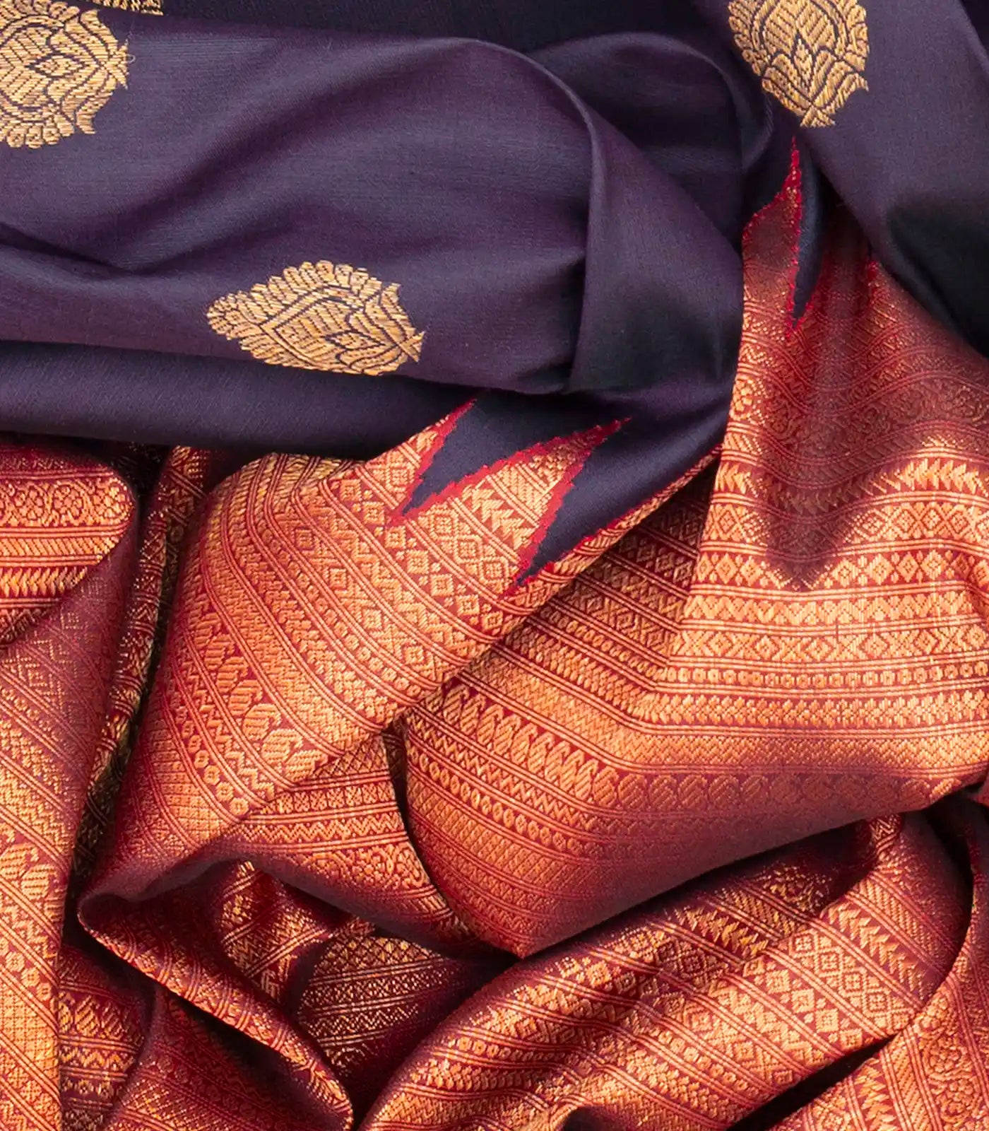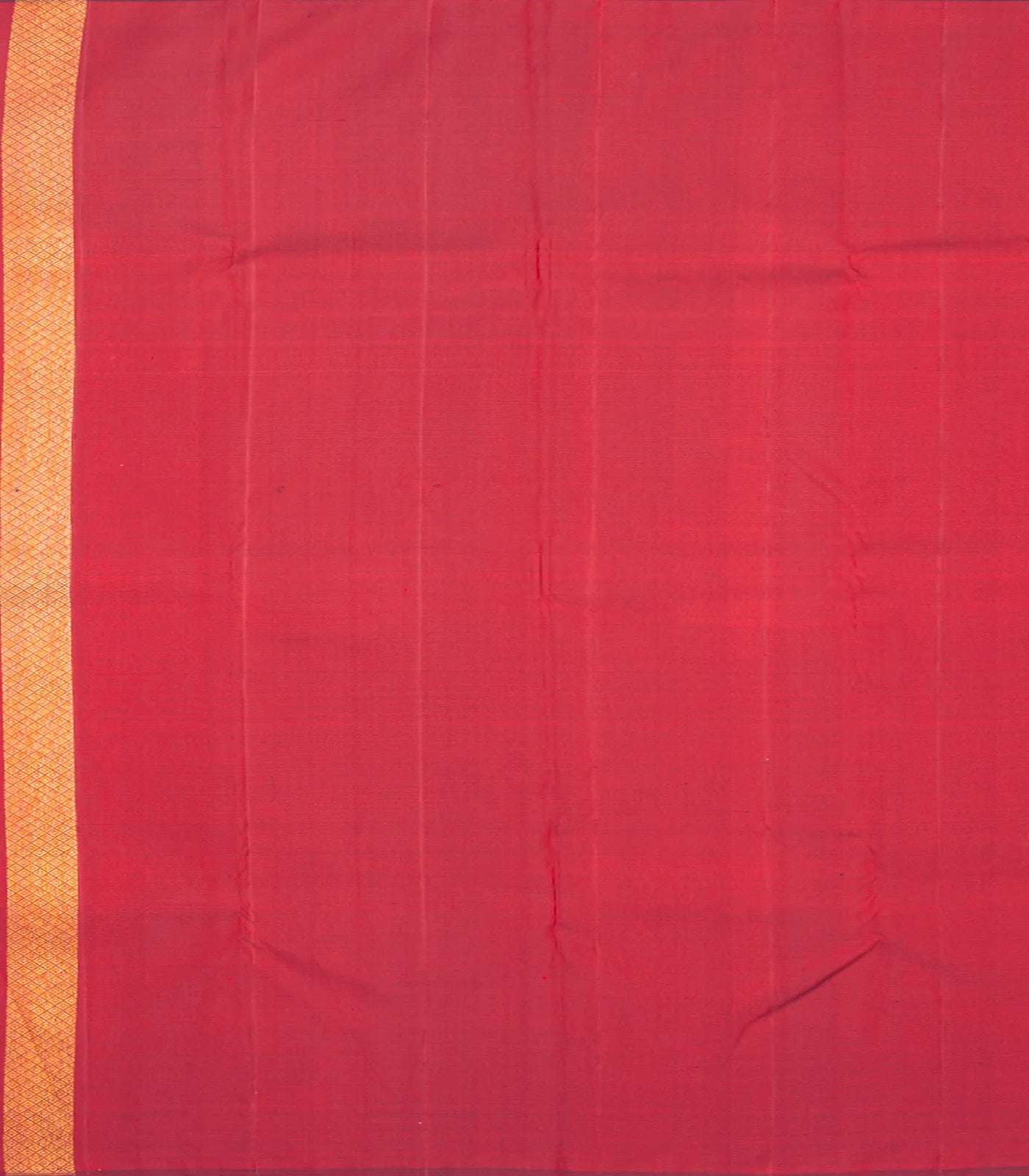 This handwoven kanchipuram korvai silk saree is embellished with floral motifs in mauve body along with traditional motifs in rising crimson border