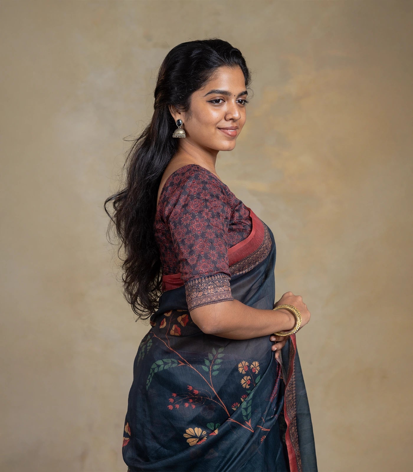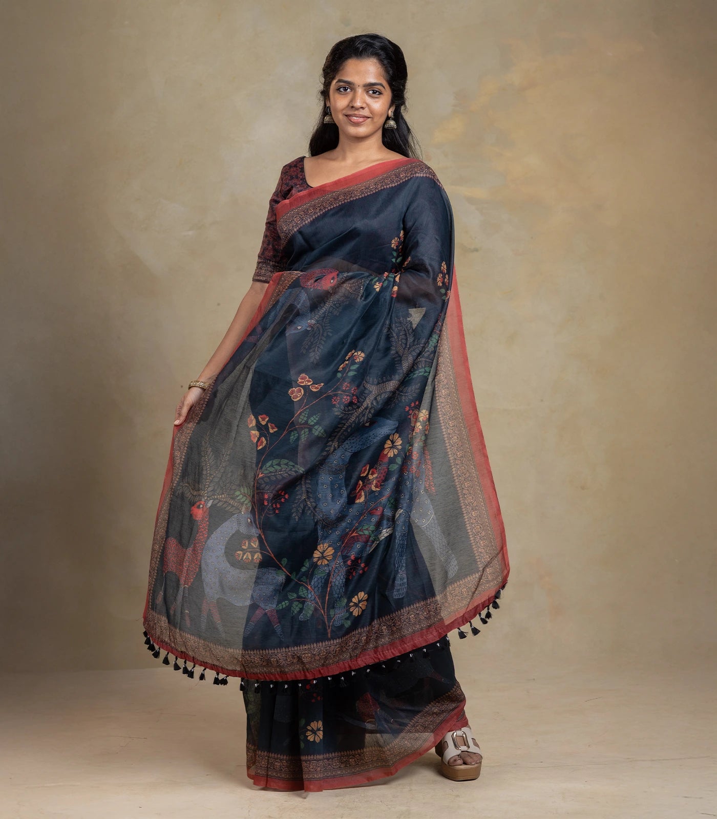 Midnight Blue Woven Art Chanderi Saree With Printed Floral Motifs