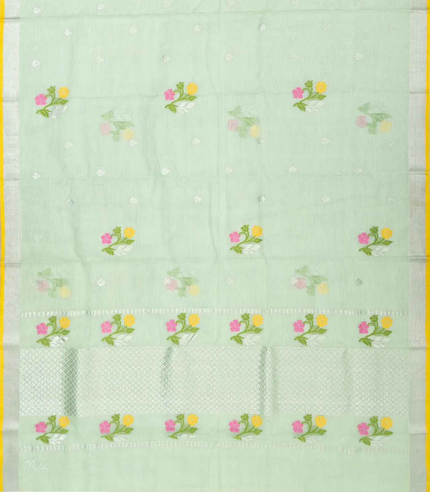 This handwoven kota silk saree is filled with meena floral motifs in mint green body along with border and pallu