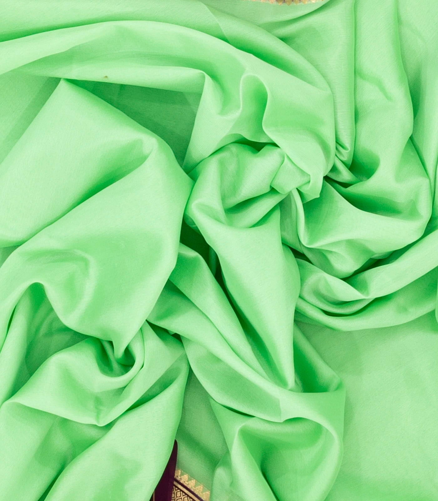 This woven mysore crepe silk saree is filled with plain mint green body along with contrast zari border and pallu