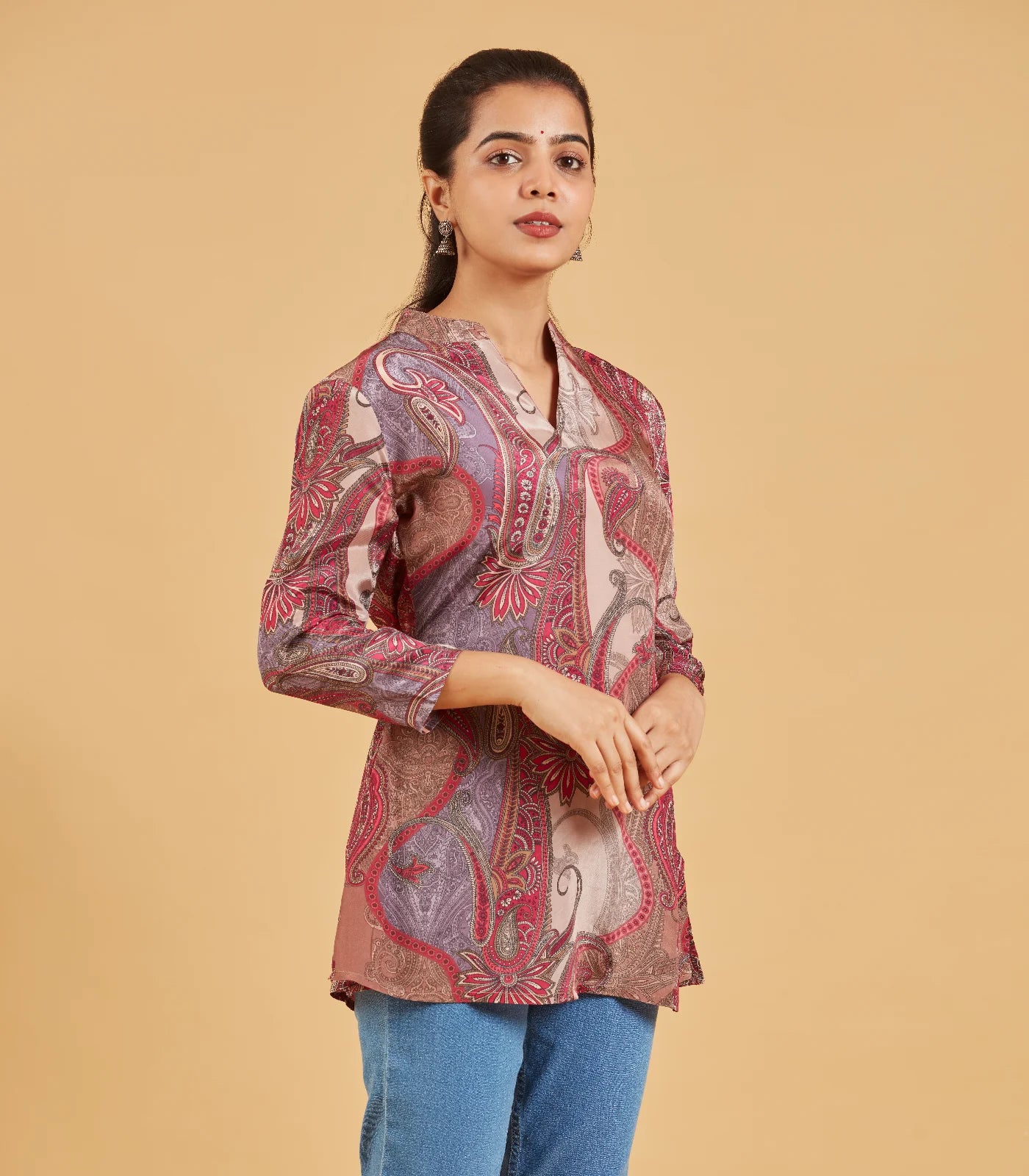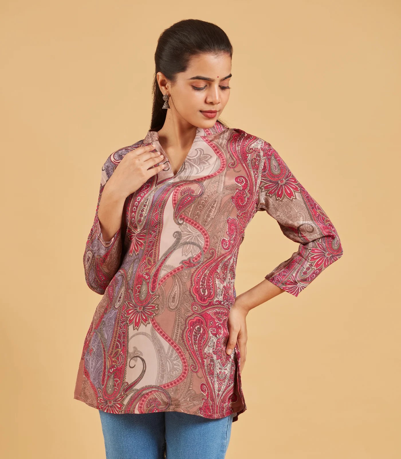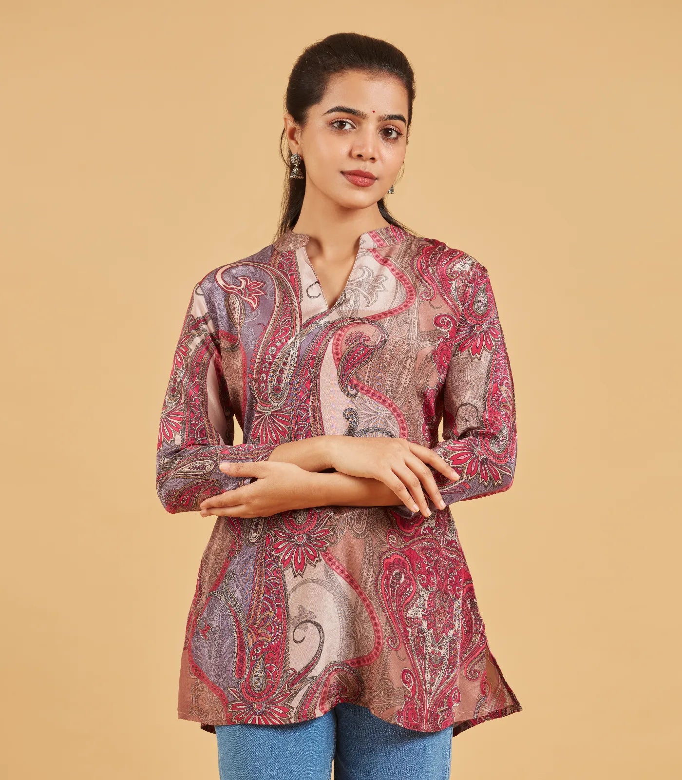 This abstract printed short top is a burst of creativity and color. The swirling patterns and bold Pink hues create a mesmerizing visual effect, making it a statement piece for any wardrobe. The short, relaxed fit is perfect for pairing with high-waisted jeans, shorts, or a skirt. Embrace your artistic side with this unique and eye-catching top.