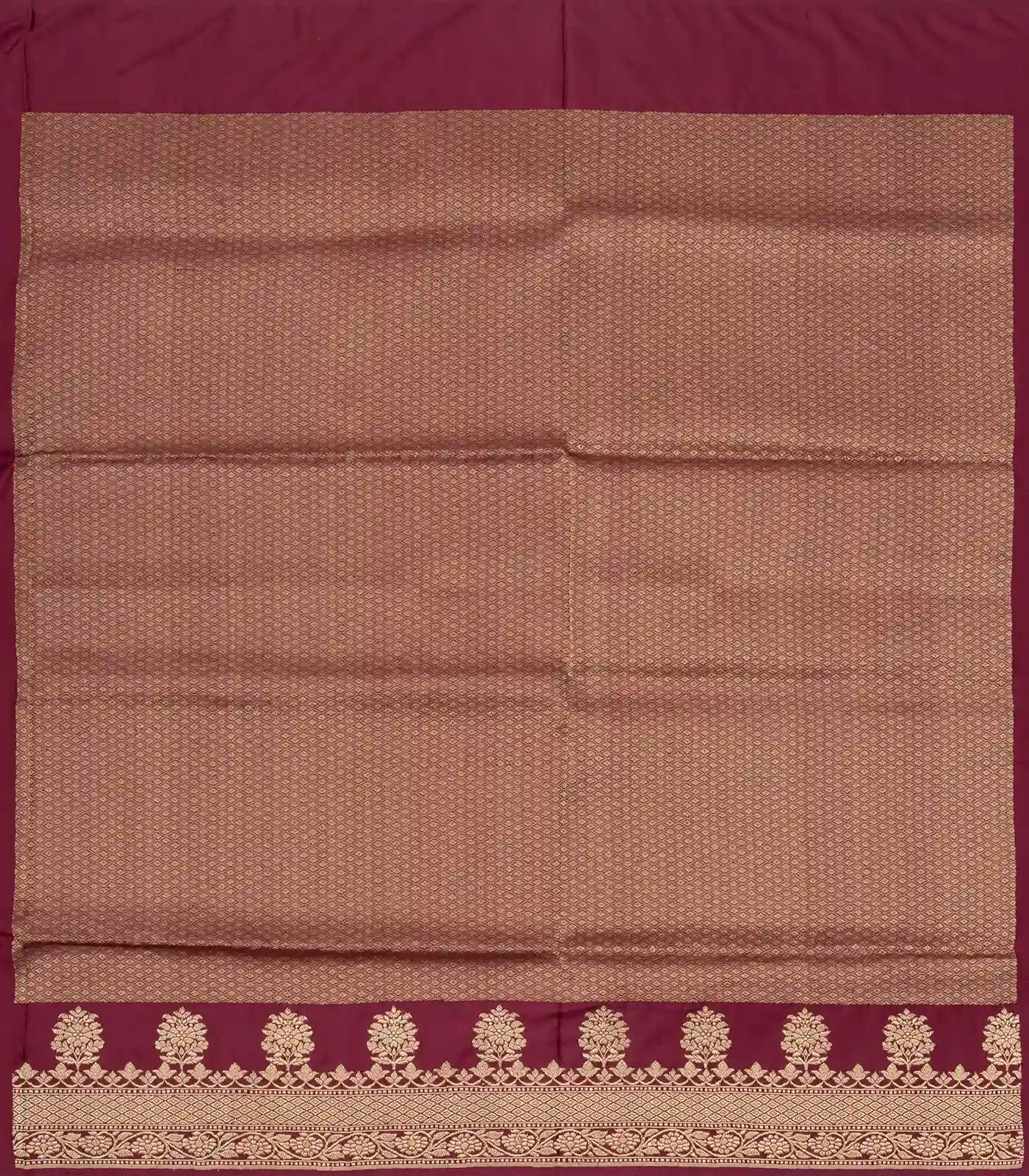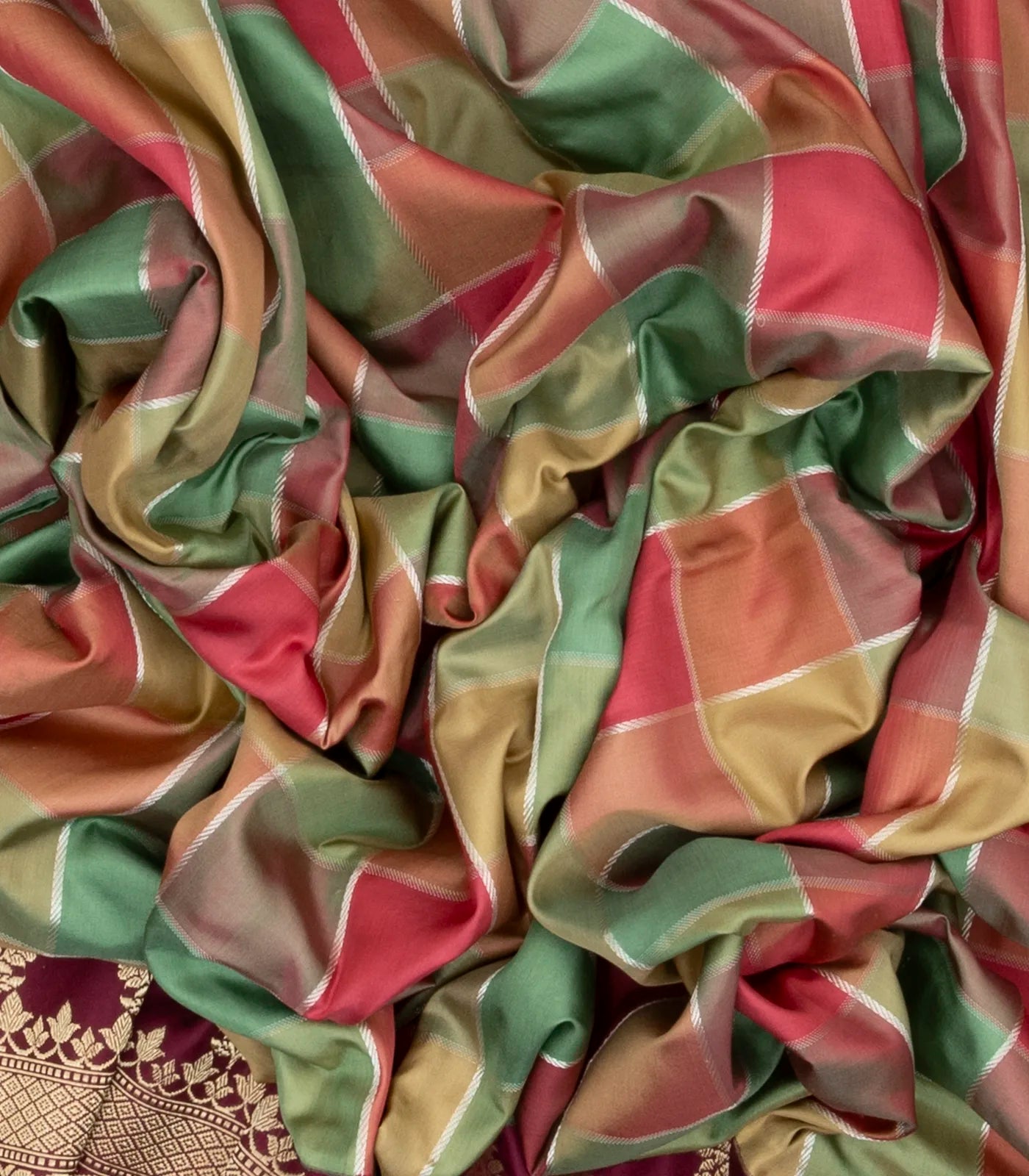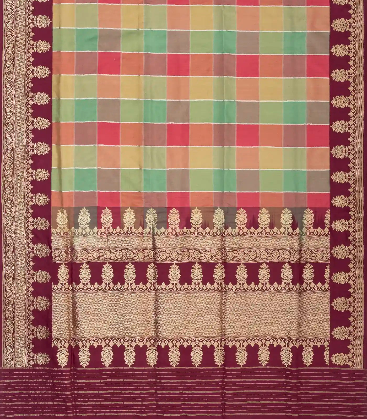 This handwoven banarasi silk saree is filled with multi colour checks in body along with contrast maroon border and pallu