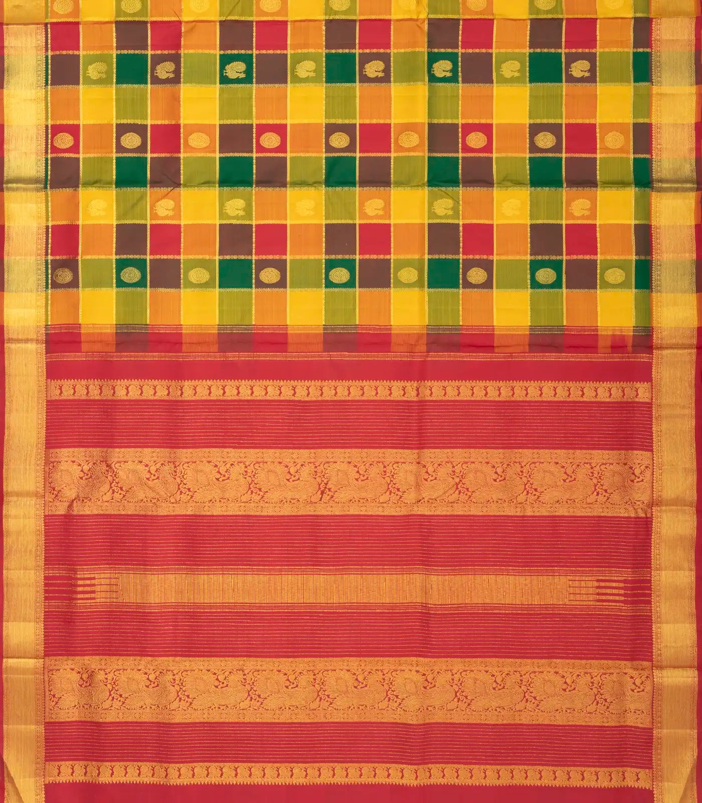 Multi Colour Handloom Kanchipuram 9 Yards Silk Saree With Checks & Buttas-KA12260