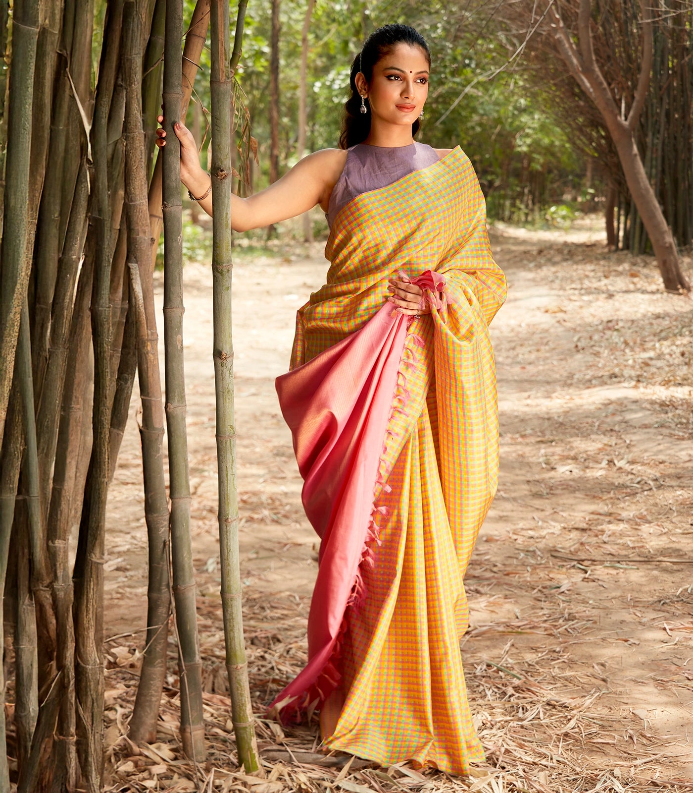 Multi Colour Handloom Kanchipuram Silk Saree With Checks-Multi colour