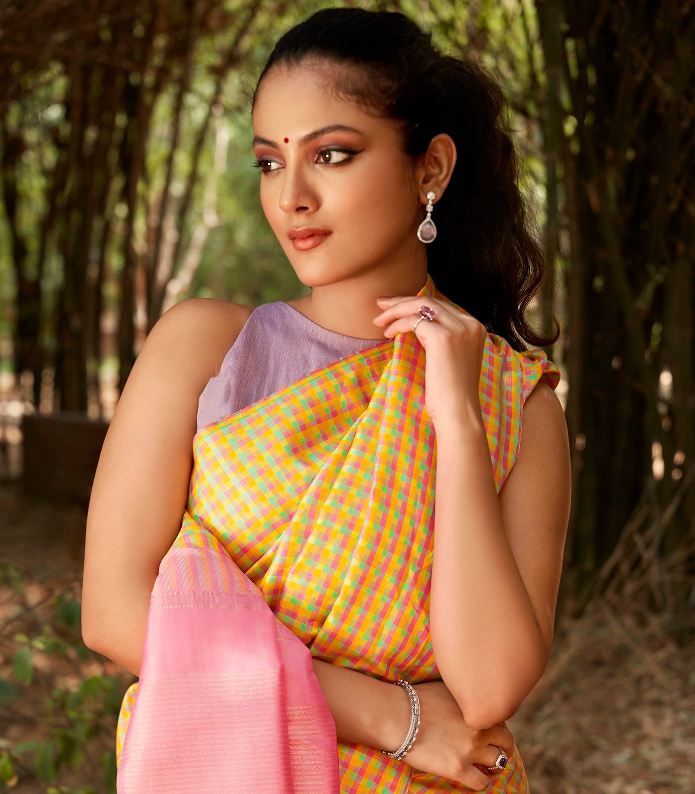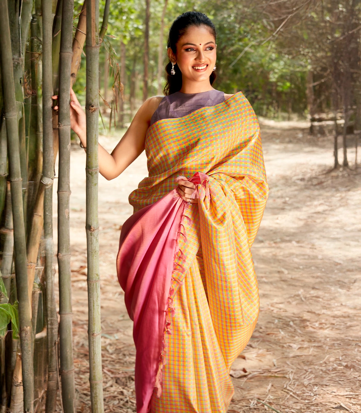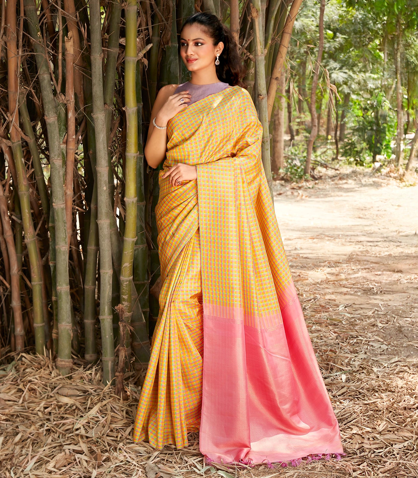 This handwoven kanchipuram silk saree is filled with checks in multi colour body along with contrast pallu