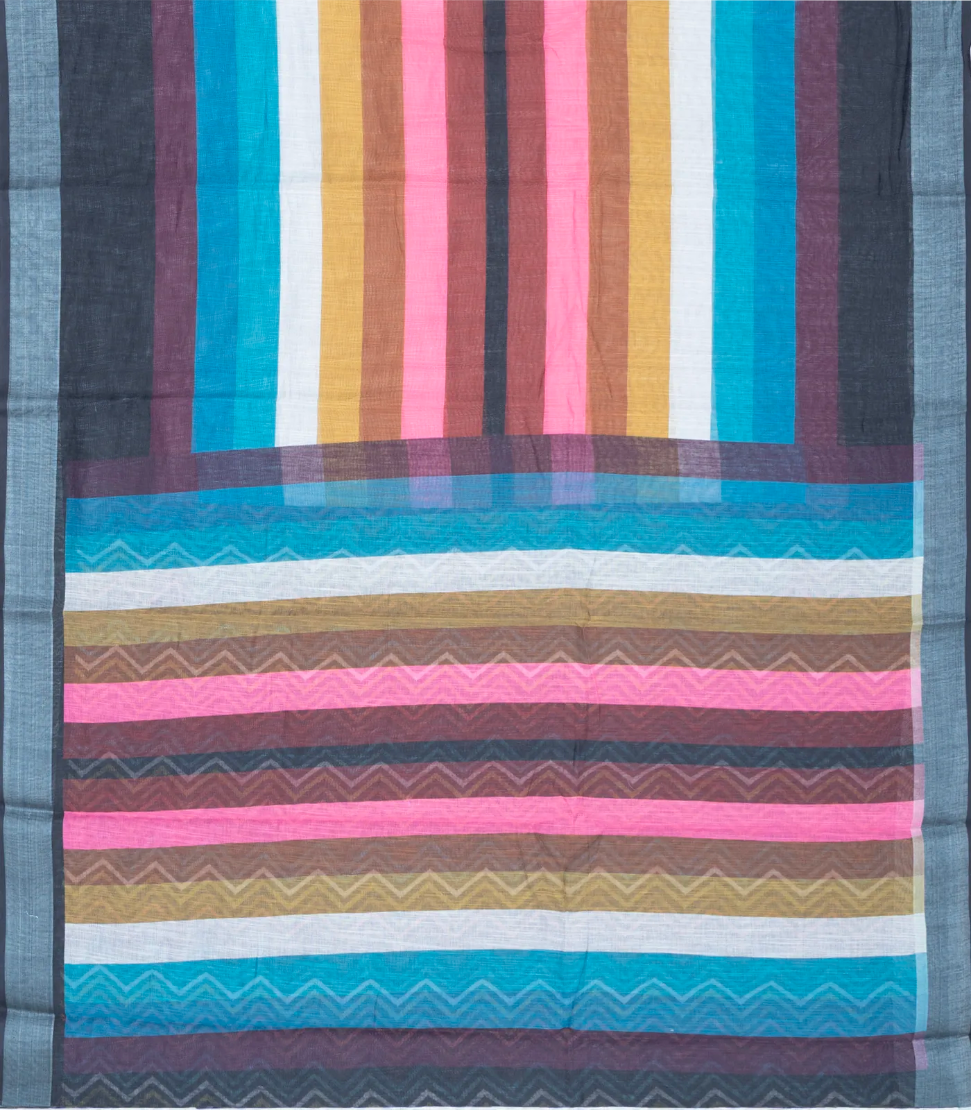 This woven art linen saree is filled with printed stripes in multi Colour body along with contrast border and pallu