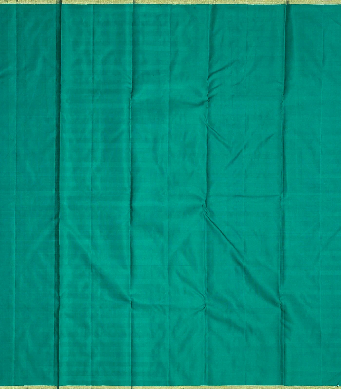 At the heart of every crimson intersection, zari woven star flower buttas bloom like scattered auspicious blossoms. A slender zari striped selvage border offers a graceful frame. The contrasting viridian pallu is a gallery of time honoured motifs. Along the top and bottom, thilagam, rudraksham (sacred bead), and thuthiripoo (stylised flower) designs pay homage to classical South Indian aesthetics. At the centre, a bold “comb tooth” motif in rich crimson silk introduce rhythm and architectural structure, bringing together tradition and symmetry in a striking finale.