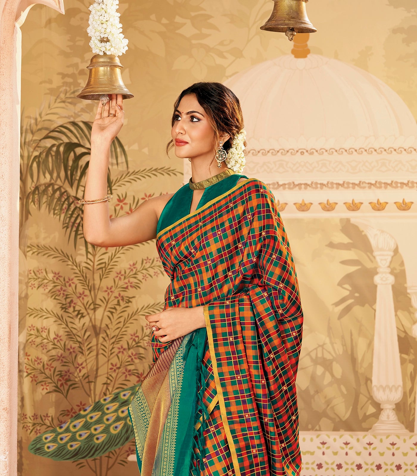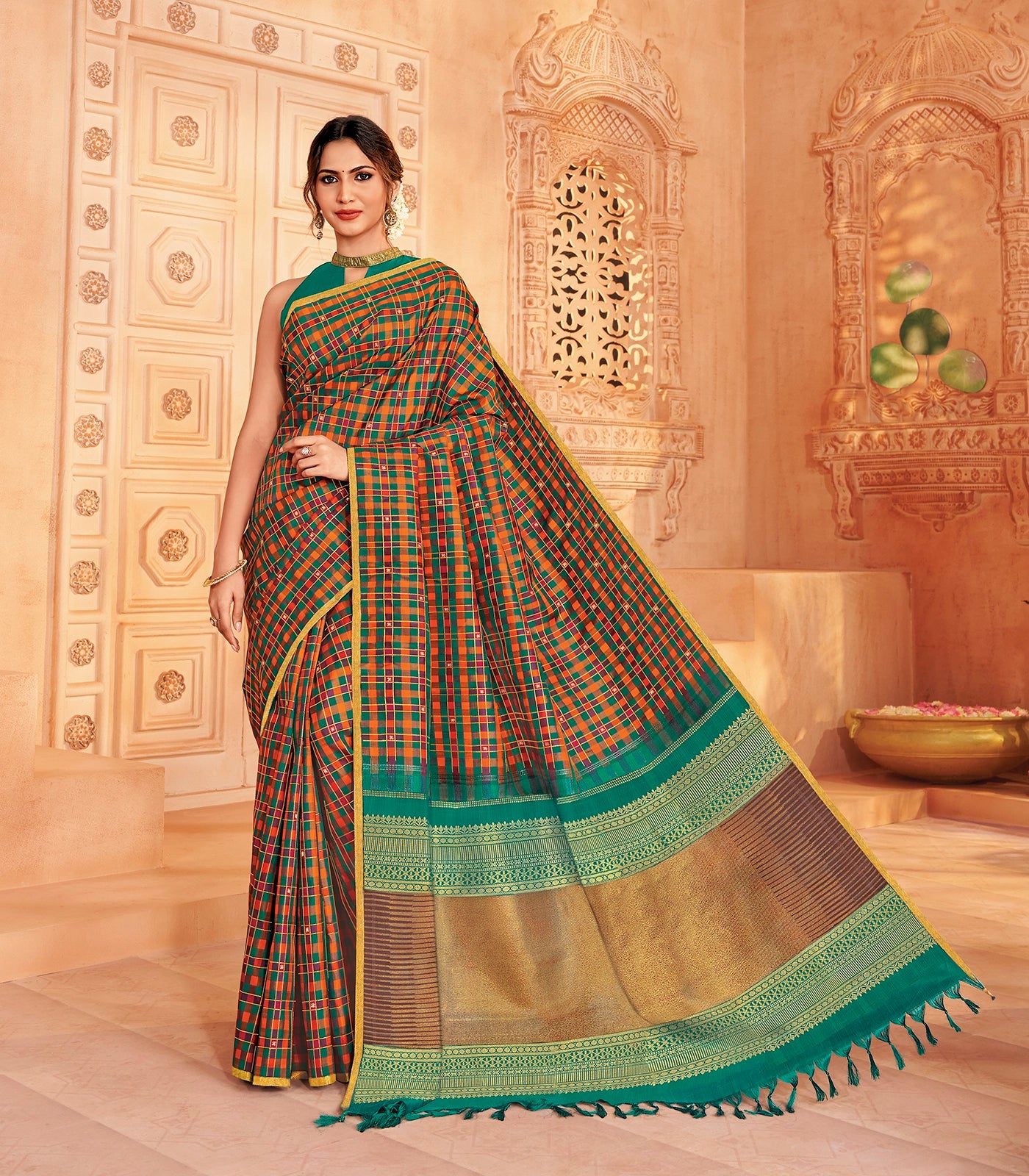 A tribute to the rich legacy of South Indian handlooms, this traditional checked silk saree conceptualised, designed and handwoven by RmKV master weavers, is a celebration of colour, craftsmanship, and cultural symbolism. The body features multicoloured checks in crimson, orange, and viridian, meticulously arranged to alternate both warp and weft wise. Each crimson thread is flanked with fine golden zari, subtly illuminating the grid and lending a refined definition to the pattern.
