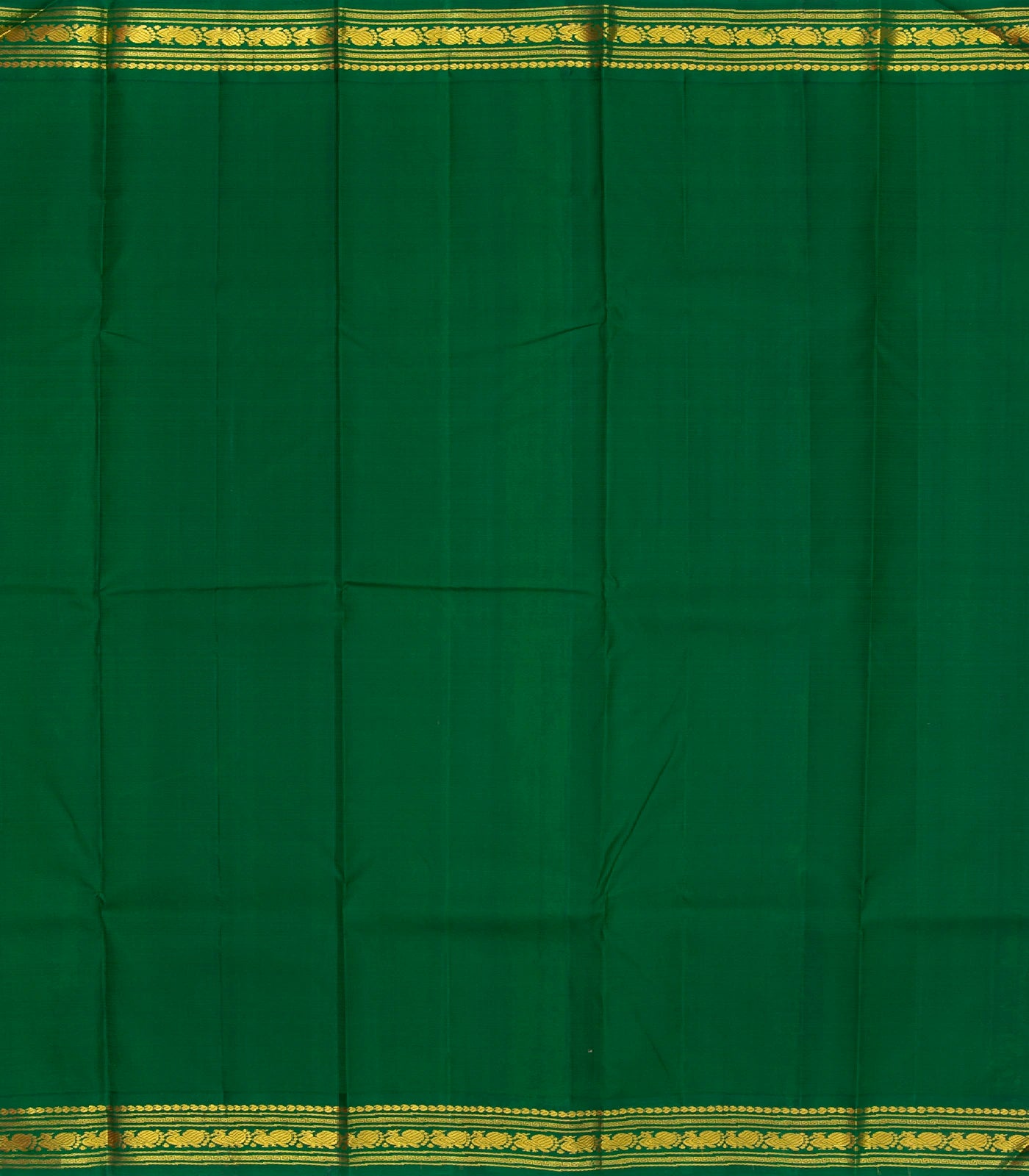 This handwoven korvai kanchipuram silk saree is filled with plain mustard body along with annam motifs in contrast green zari border and pallu