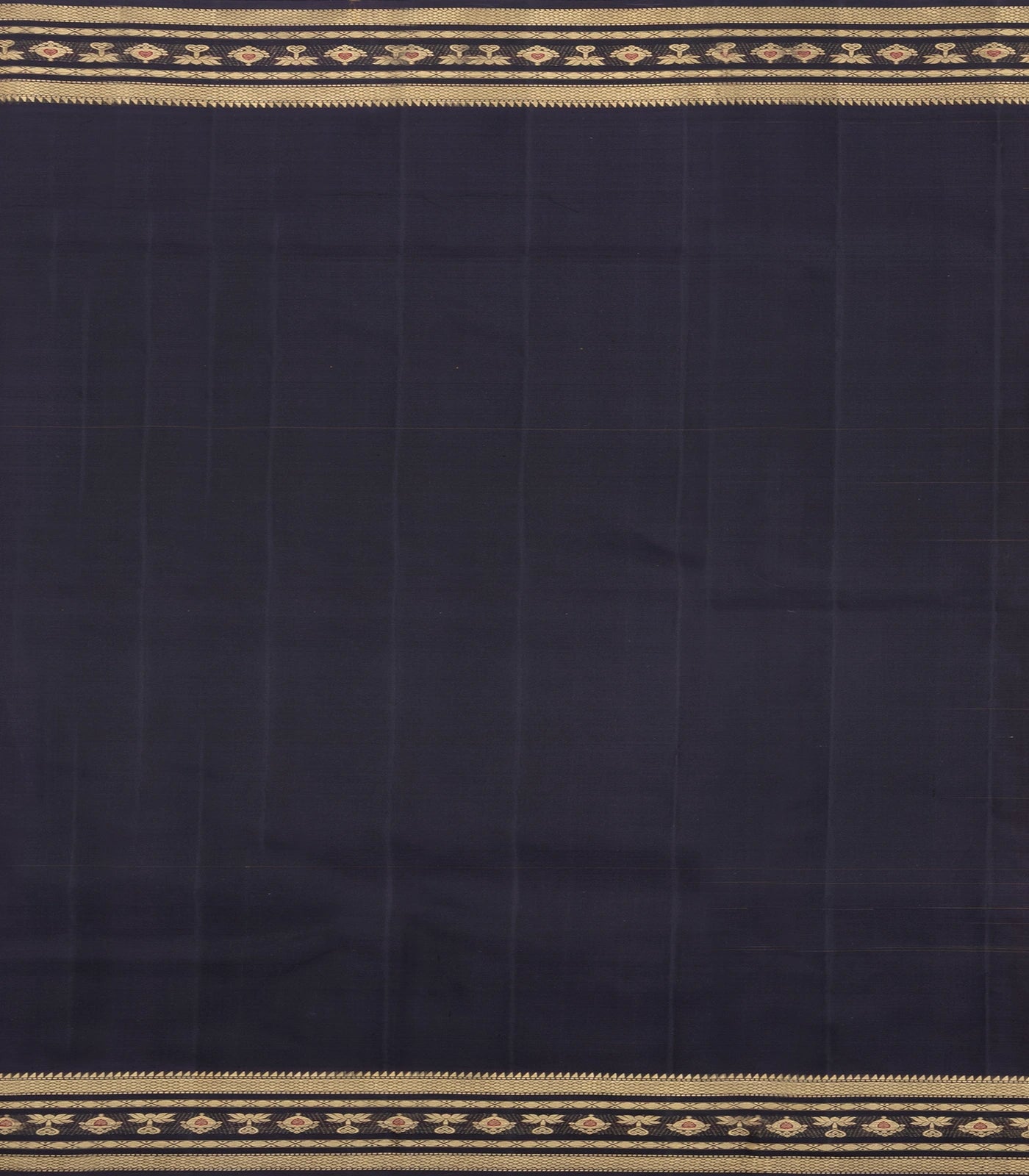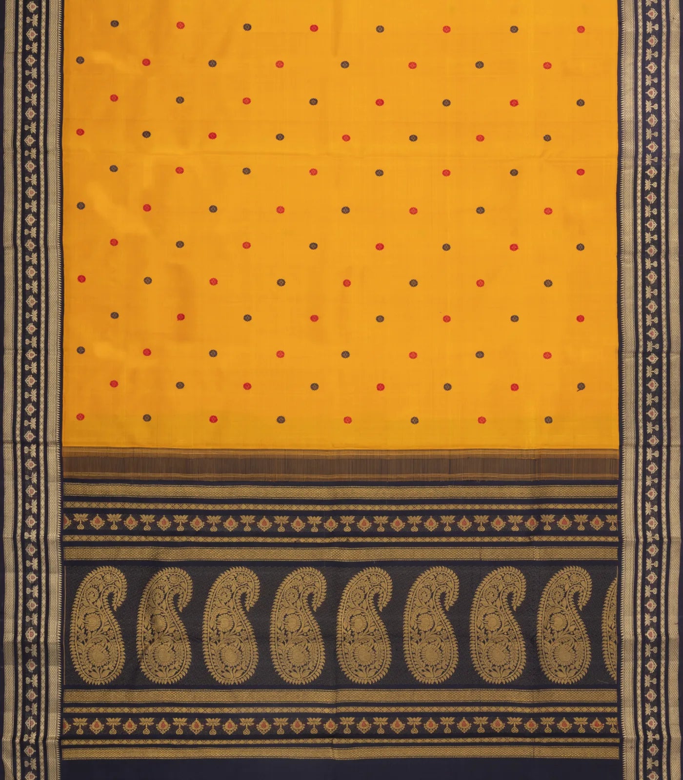 This handwoven korvai kanchipuram silk saree is filled with meena buttas in mustard body along with contrast meena border and pallu