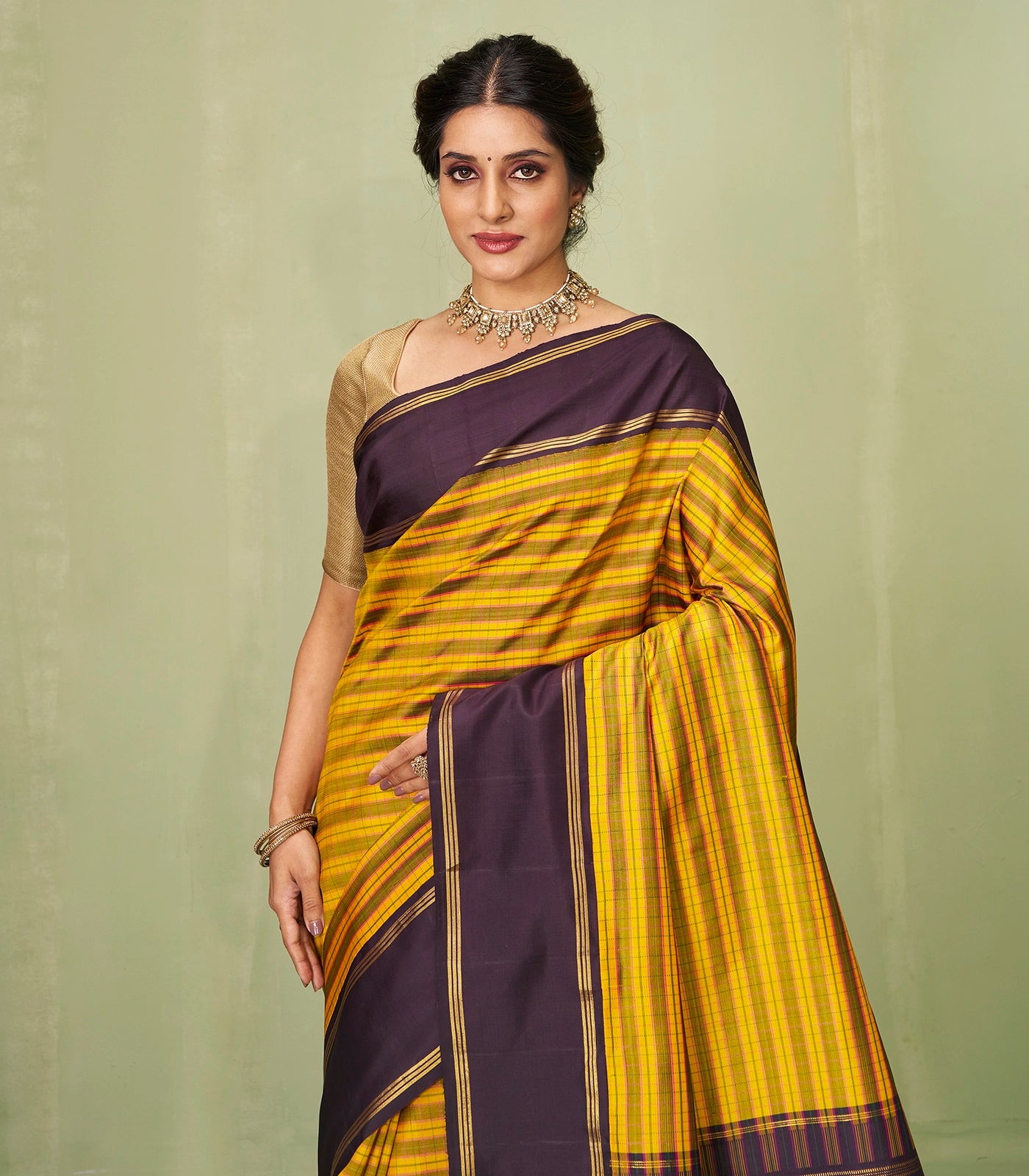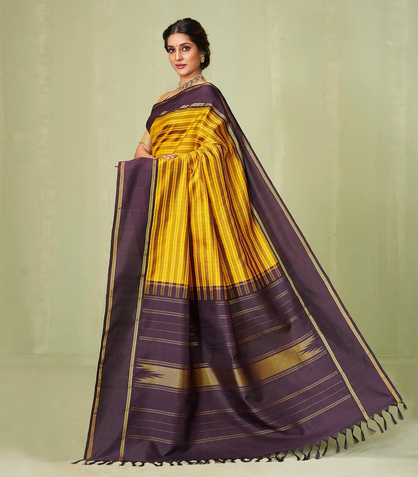 This handwoven korvai kanchipuram silk saree is filled with stripes in mustard body along with contrast black border and pallu