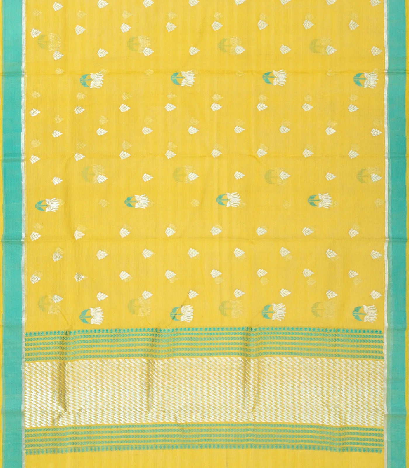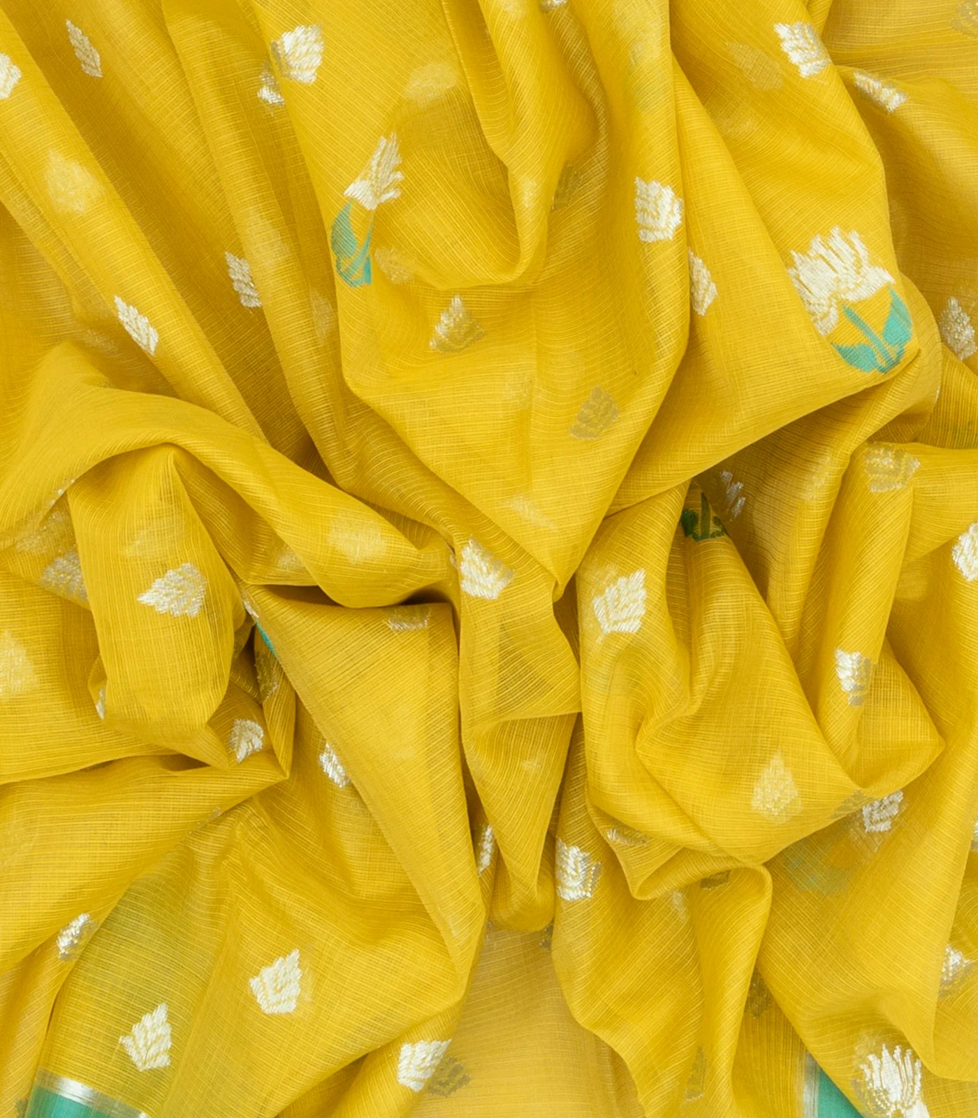 This handwoven kota silk saree is filled with meena floral buttas in mustard body along with contrast border and pallu
